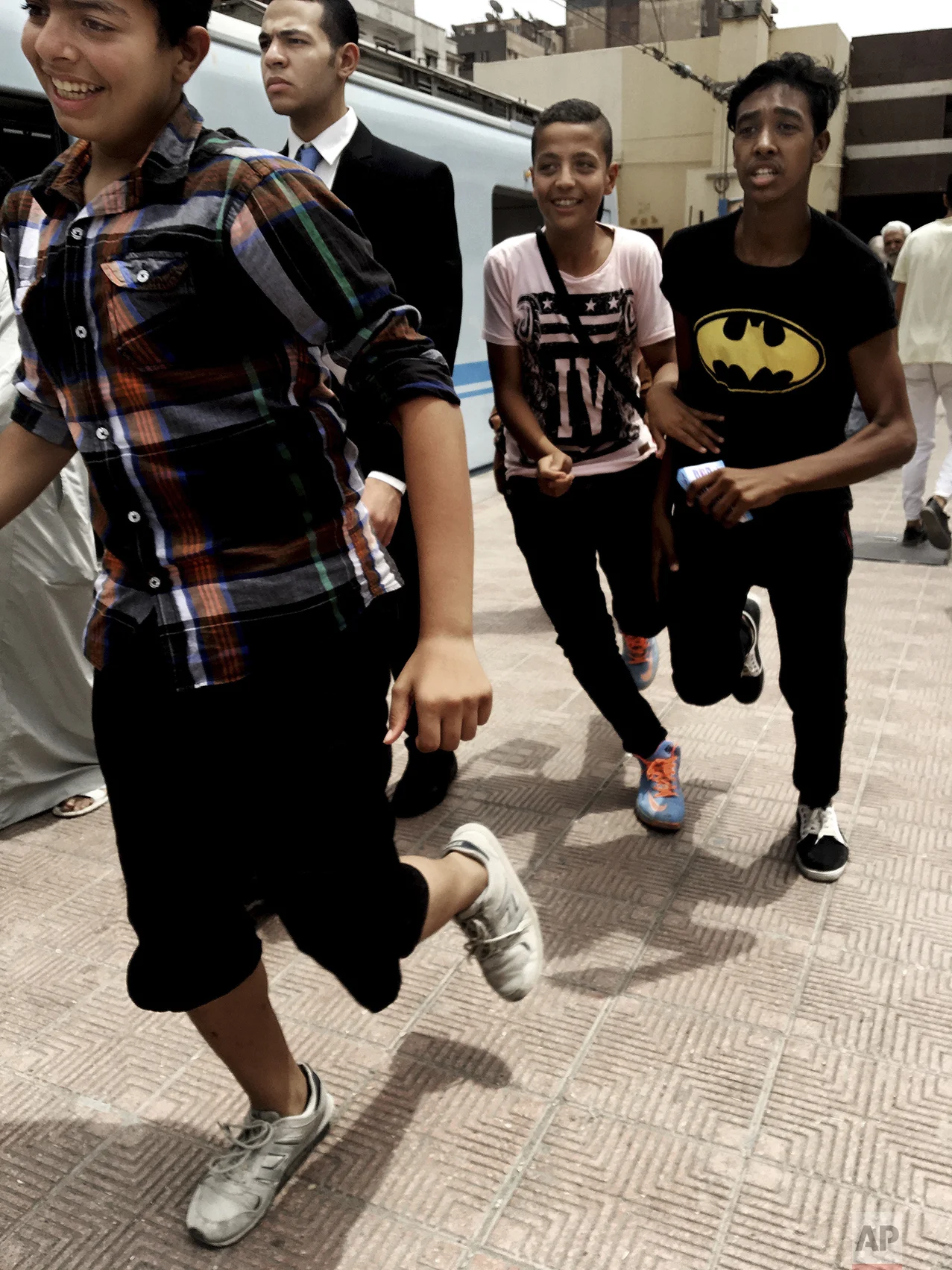 In this May 17, 2017 photo, boys run to get on a train at Helwan metro station, in Cairo, Egypt. (AP Photo/Nariman El-Mofty)