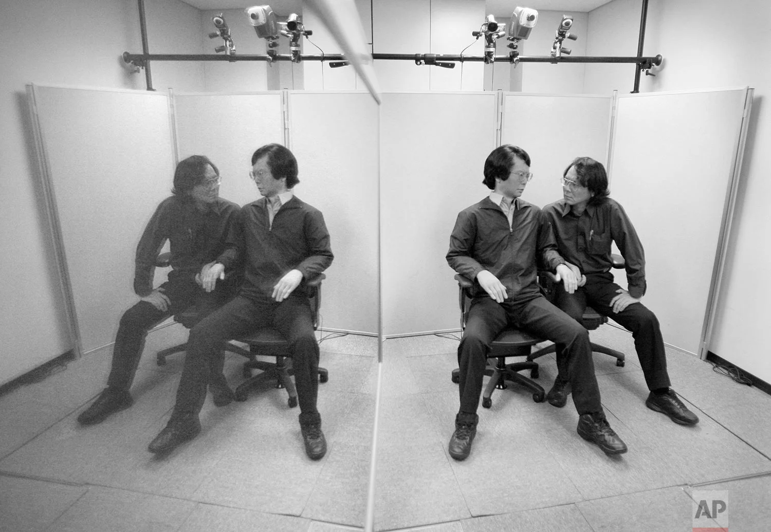 In this Aug. 28, 2007 photo, Japanese robot creator Hiroshi Ishiguro interacts with a humanoid he designed to look and behave exactly like himself at his laboratory in Osaka, Japan. Japan faces a vast challenge in making the leap _ commercially and culturally _ from toys, gimmicks and the experimental robots churned out by laboratories to full-blown human replacements that ordinary people can afford and use safely. (AP Photo/David Guttenfelder)