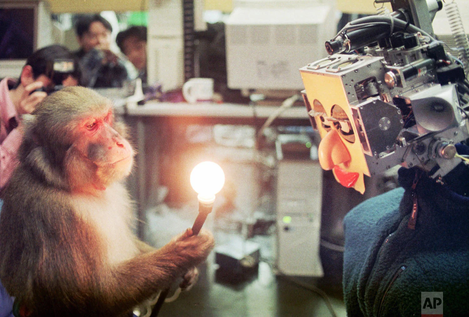 In this Saturday, Nov. 1, 1997 photo, the robot "Hadaly 2" follows the movement of a light held by Choromatsu, a 10-year-old male monkey, during an experiment at Waseda University in Tokyo. The university's team, which has been working on humanoid robots for more than 30 years, held the world first ever interface experiment between robot and monkey. (AP Photo/Katsumi Kasahara)