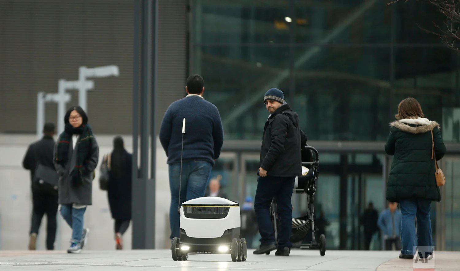 In this Thursday, March, 10, 2016 photo, a pedestrian looks back at a delivery robotic device that has the capacity to hold 6-8 kilograms (13-17 pounds) of cargo in London. The six wheeled intelligent robot that uses GPS systems will make its debut in Greenwich after talks with the local authority led to a partnership with the firm. Greenwich is one of the few areas in the UK that allows unmanned robotic units to be used in public under special license. (AP Photo/Alastair Grant)