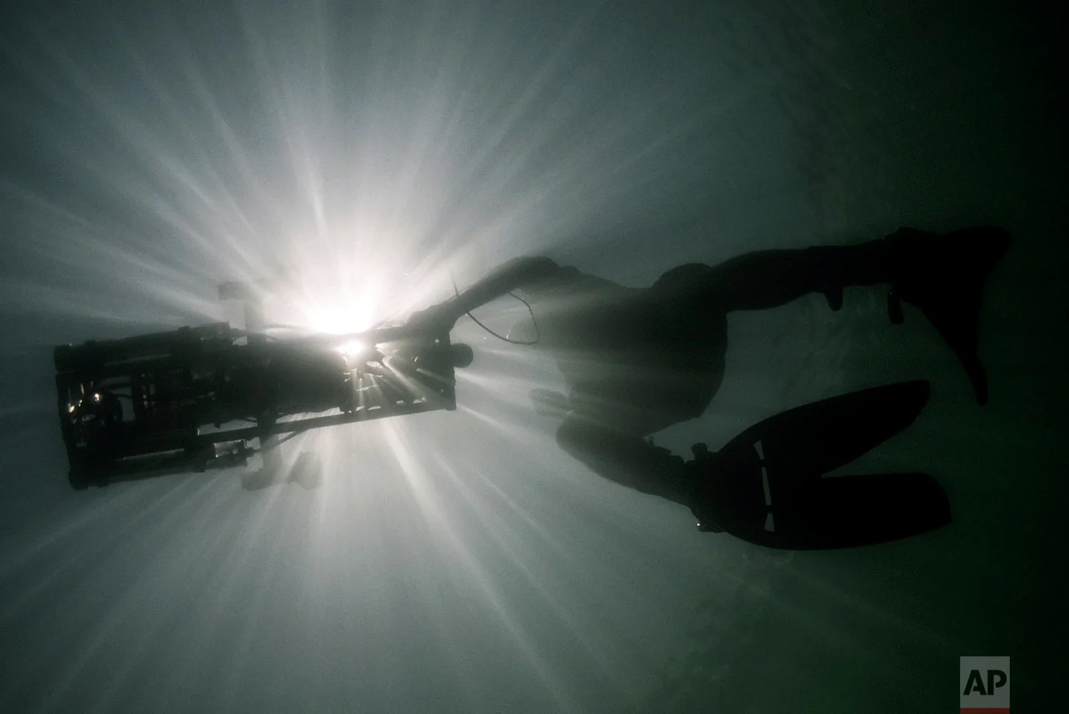 In this Friday, Aug. 4, 2006 photo, a diver, right, pushes an underwater autonomous robot in a test pool during the 2006 International Autonomous Underwater competition in San Diego. The challenge was to create a robot that could, free of human control, carry out a series of sinking, swimming and resurfacing tasks in the 38-foot-deep pool. (AP Photo/Chris Park)