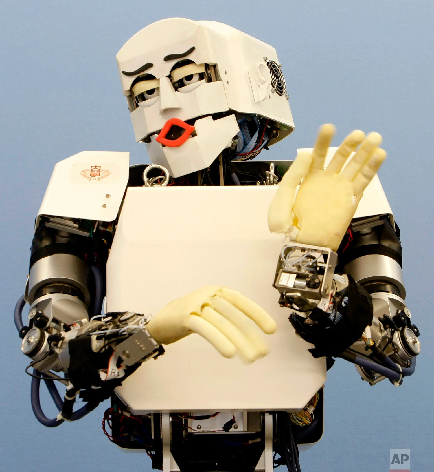 In this Tuesday, June 23, 2009 photo, humanoid robot KOBIAN shows an emotional display of "disgust" during a demonstration at Waseda University in Tokyo. KOBIAN, that can express seven programmed emotions by using its entire body including facial expressions, has been developed by researchers at Waseda's Graduate School of Advanced Science and Engineering, led by Prof. Atsuo Takanashi, and robot manufacturer tmsuk, based in Kita Kyushu, southern Japan. (AP Photo/Shizuo Kambayashi)