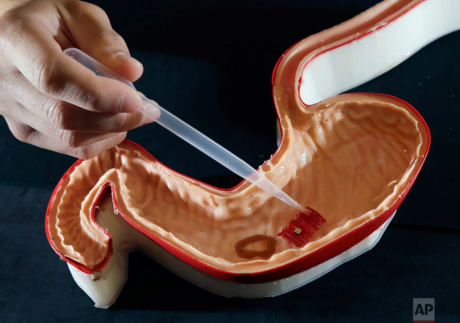 In this July 13, 2016 photo, Steven Guitron, a mechanical engineering masters student at the Massachusetts Institute of Technology, points a pipette at a tiny "origami robot" floating toward a "wound" in a stomach model in Cambridge, Mass. Guitron, and others at MIT have developed these tiny ingestible robots which are folded up to be swallowed to complete certain tasks inside the body. So far they can be used to patch wounds, remove foreign objects, and even deliver medicine within the body. The robots unfold when ingested, and can be controlled by magnet forces outside of the body. (AP Photo/Elise Amendola)