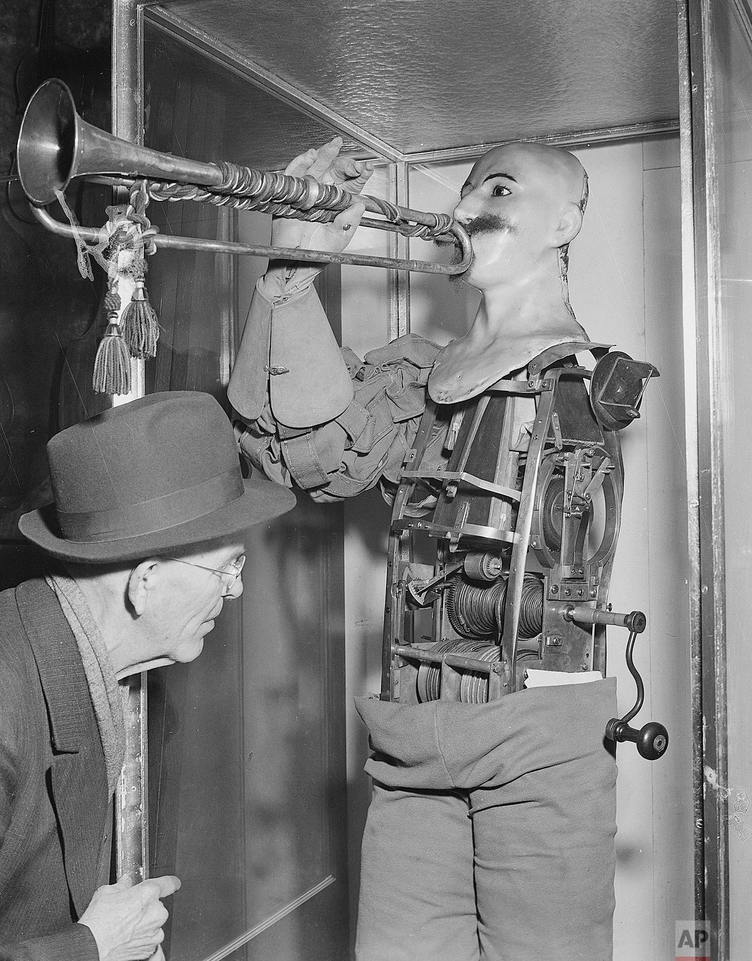 In this April 30, 1950 file photo, a man inspects what is said to be the first robot in history on display in the Deutsches Museum in Munich. The "soldier," which has an automatic bellows that blows a trumpet, was made in 1810 by Friedrich Kauffman of Dresden, Germany (AP Photo/Heinrich Sanden)