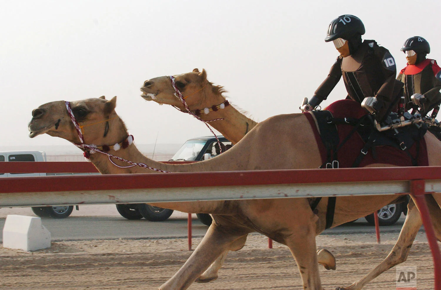 In this Wednesday, July 13, 2005 file photo, robot jockeys race camels at Al Shahaniyya Camel Racecourse on the outskirts of Doha, Qatar. Seven robots participated in the race. In 2004, Qatar banned the use of children as jockeys in camel races. According to the race officials the first ever robot camel race was a successful event. (AP Photo)