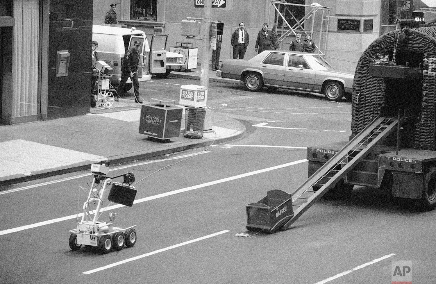 In this Wednesday, April 20, 1983 file photo, a bomb removal robot, remote controlled by police, at left around the corner, carries a briefcase believed to be a bomb to a waiting truck in New York. It turned out that the suitcase held telephone repairman tools. (AP Photo/David Bookstaver)