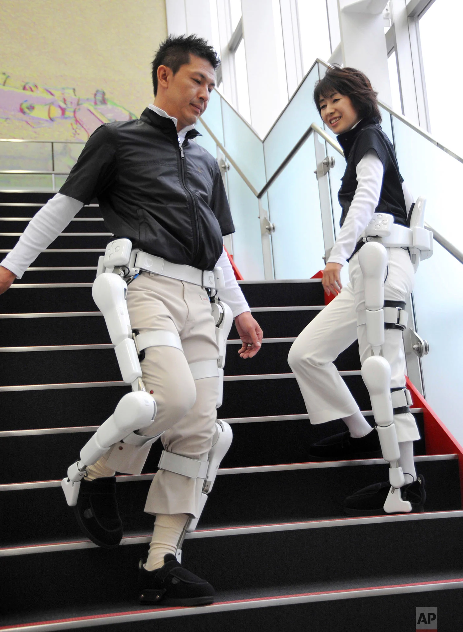 In this Tuesday, Oct. 7, 2008 photo, robotic suits named HAL (Hybrid Assistive Limb) are demonstrated during a news conference at the headquarters of Cyberdyne, a new company in Tsukuba, outside Tokyo. HAL, which reads brain signals and helps people with mobility problems, will be available to rent in Japan for US$2,200 for both legs and $1,500 for a one leg a month and may have far-reaching benefits for the disabled and elderly. (AP Photo/Katsumi Kasahara)