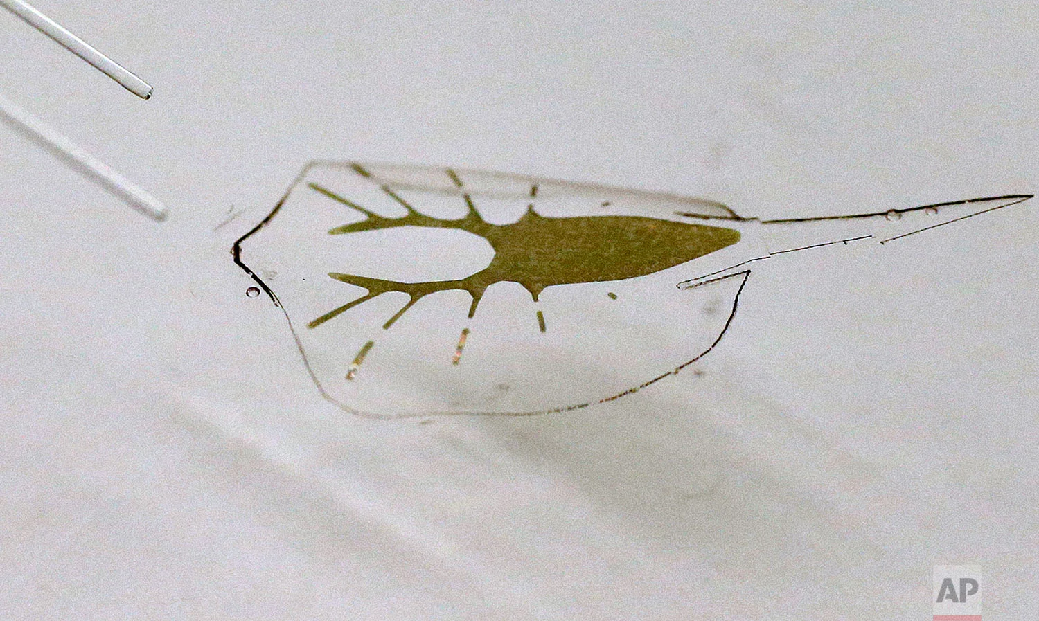 In this Wednesday, Aug. 3, 2016 photo, a tissue-engineered robot swims in a tank of water in a laboratory at Harvard University in Cambridge, Mass. The stingray-shaped robot, capable of swimming in water after exposure to blue light, has a gold skeleton, silicone fins and the heart muscle cells of a rat. (AP Photo/Steven Senne)