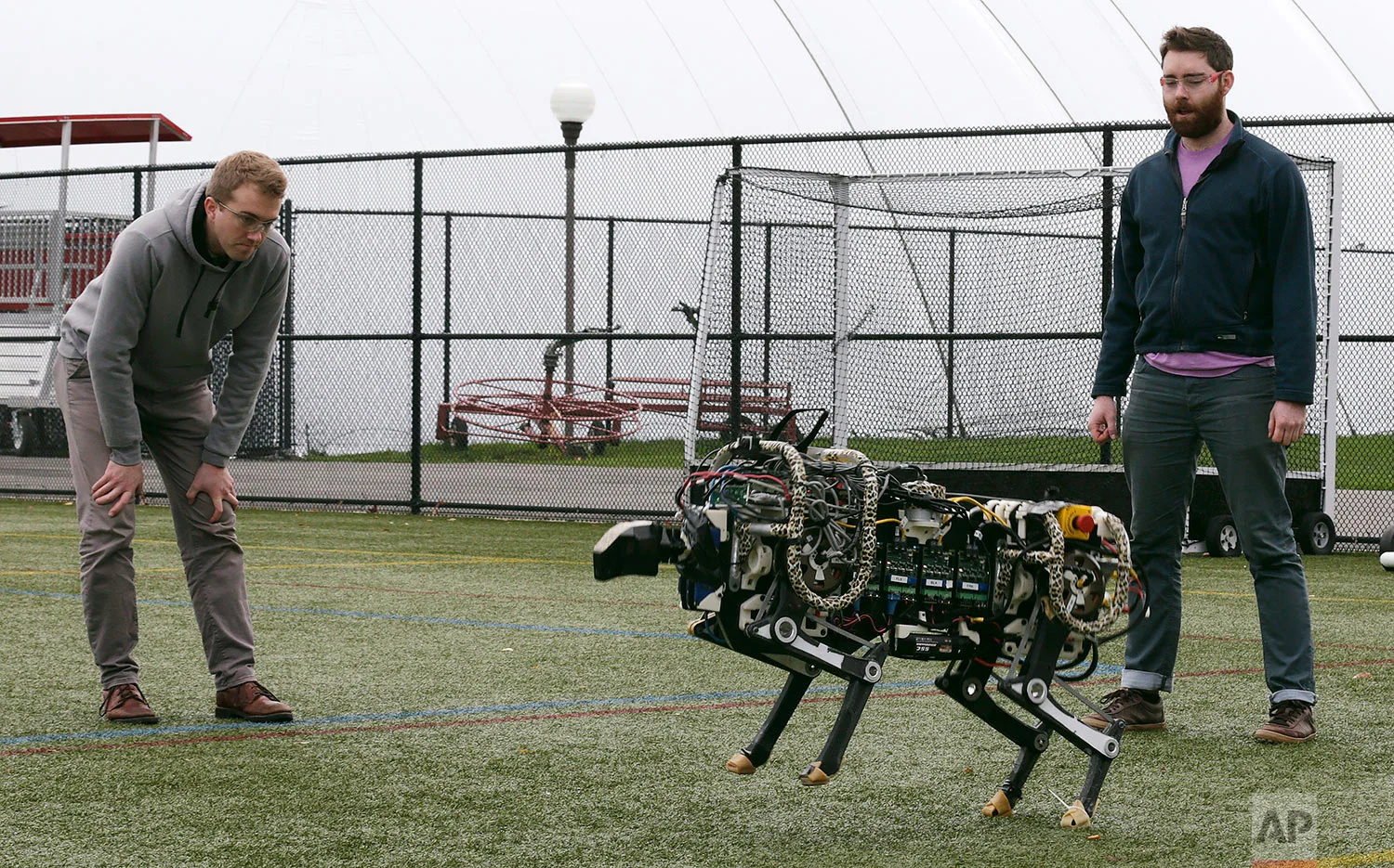 In this Oct. 24, 2014 photo, researchers Randall Briggs, left, and Will Bosworth monitor a robotic cheetah during a test run on an athletic field at the Massachusetts Institute of Technology in Cambridge, Mass. MIT scientists said the robot, modeled after the fastest land animal, may have real-world applications, including development for prosthetic legs. (AP Photo/Charles Krupa)