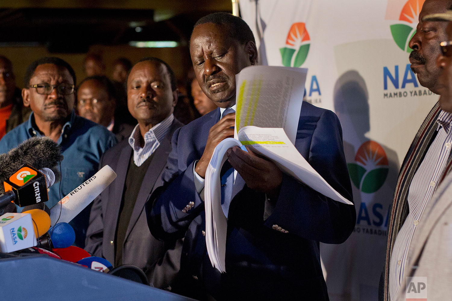 Opposition leader and presidential candidate Raila Odinga addresses a news conference in Nairobi, Kenya, Wednesday, Aug. 9, 2017. Odinga says hackers infiltrated the database of the country's election commission and manipulated the results. Early results show President Uhuru Kenyatta with a wide lead over Odinga. (AP Photo/Jerome Delay)