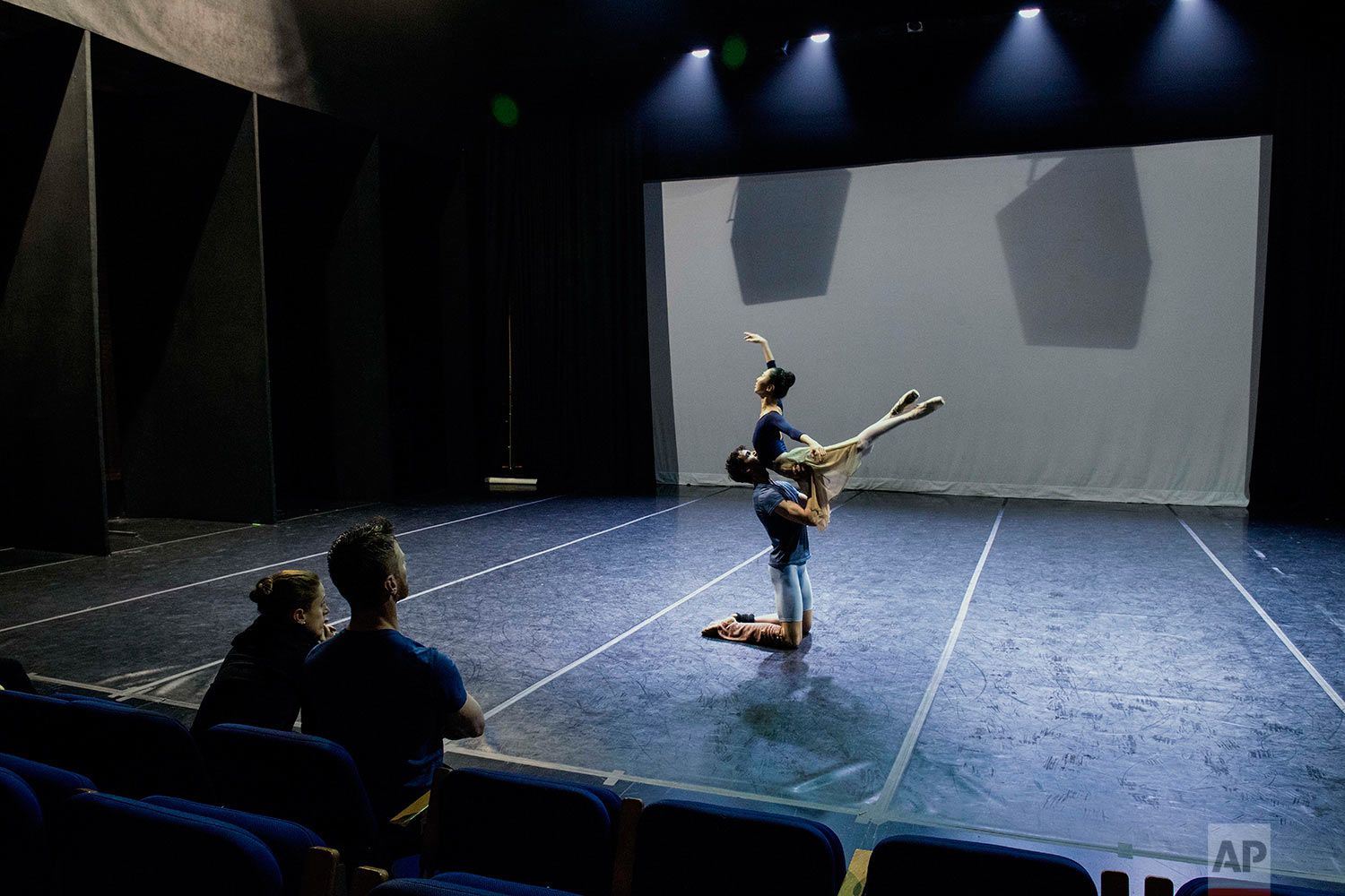 In this Tuesday, Sept. 12, 2017 photo, ballet master Bruce Sansom, sitting center, give feedback to a dancer rehearsing for Romeo and Juliet in Montevideo, Uruguay. (AP Photo/Matilde Campodonico)