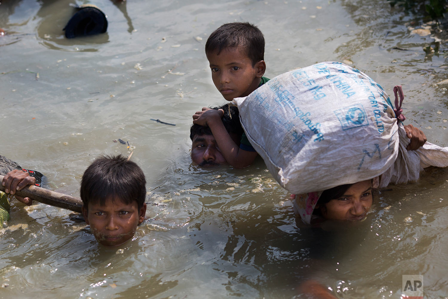 “Oh Allah, Oh Allah,” one family moaned as they waded Tuesday through the chin-high waters of the Naf River dividing the two countries. One panicking woman handed a 3-month-old infant to a taller man before she slipped momentarily beneath the murky water. For a terrifying moment, the man held the baby aloft with one hand as he steadied himself. Then as the woman remerged, the group moved on to the safety of Bangladesh on the opposite bank.