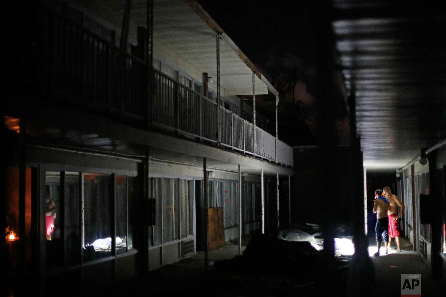 Residents use flashlights to navigate the dark walkways at night at the damaged American Quality Lodge where they continue to live in the aftermath of Hurricane Michael, in Panama City, Fla., Oct. 16, 2018. (AP Photo/David Goldman)