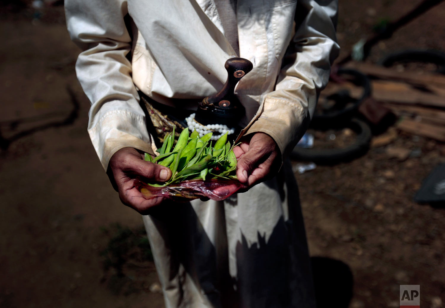 A man holds Halas before cooking for his children, a climbing vine of green leaves, in Aslam, Hajjah, Yemen. (AP Photo/Hani Mohammed)