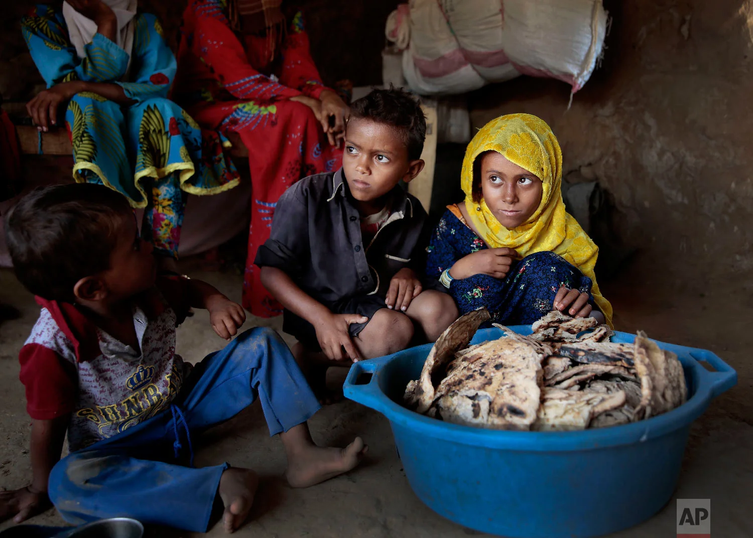 Children sit in front of moldy bread in their shelter, in Aslam, Hajjah, Yemen. (AP Photo/Hani Mohammed)