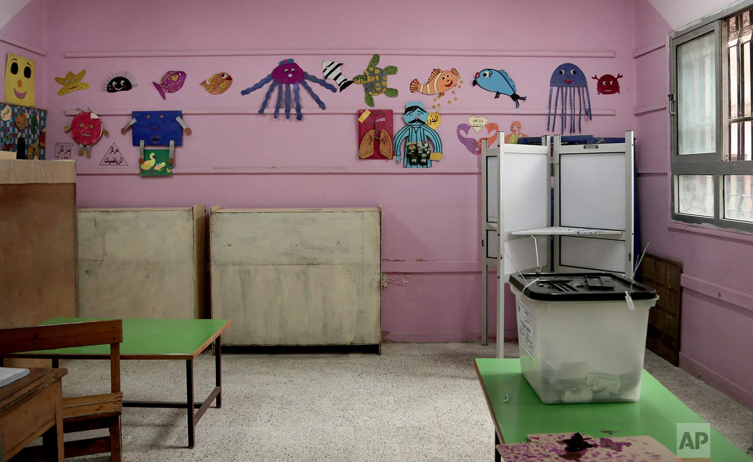 An empty polling station on the third day of the presidential election inside a polling station in the popular district of Shubra, Cairo, Egypt Wednesday, March 28, 2018. (AP Photo/Nariman El-Mofty)