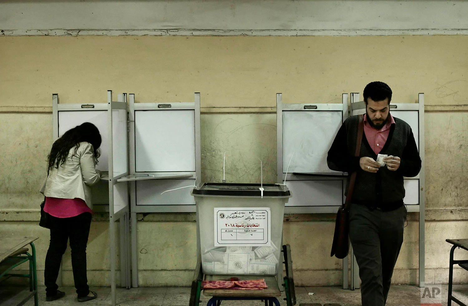 People vote inside polling station at a school in the Omraniyah district of Giza, Egypt Tuesday, March 27, 2018. Turnout appeared low as Egyptians voted on the second day of an election that President Abdel-Fattah el-Sissi is virtually certain to win, after all serious rivals were either arrested or intimidated into dropping out. (AP Photo/Nariman El-Mofty)