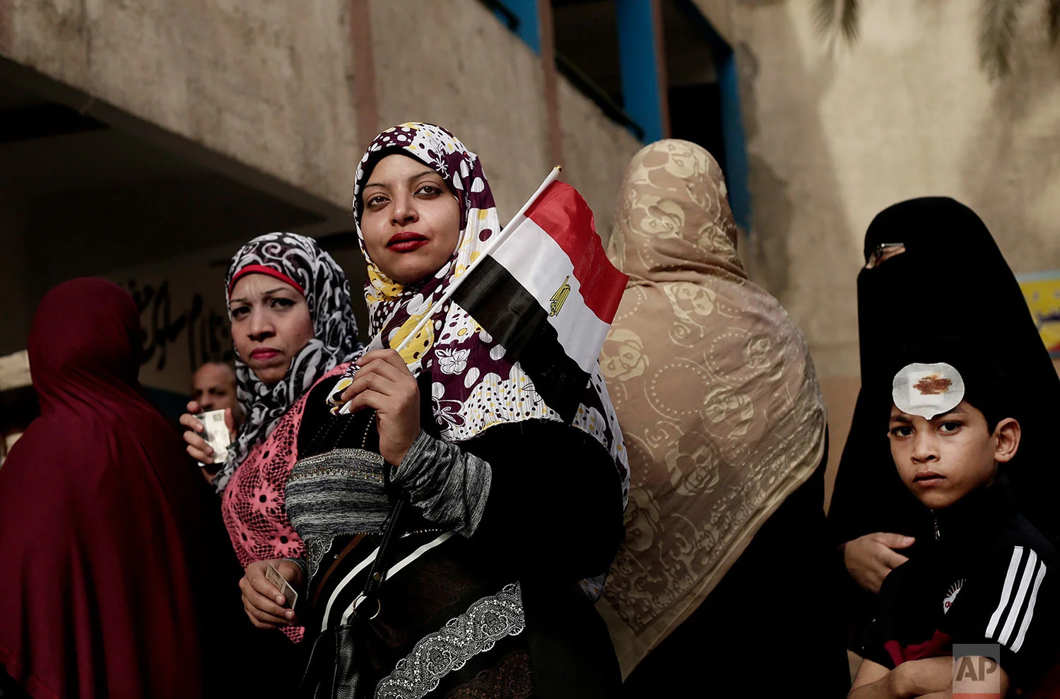 Egyptian men wave national flags as they wait in line to vote during the first day of the presidential election in front of a polling site in Cairo, Egypt, Monday, March 26, 2018. Egyptians head to the polls on Monday but the presidential election this time is not about who wins — that was settled long ago — but about how many people bother to cast ballots. (AP Photo/Nariman El-Mofty)