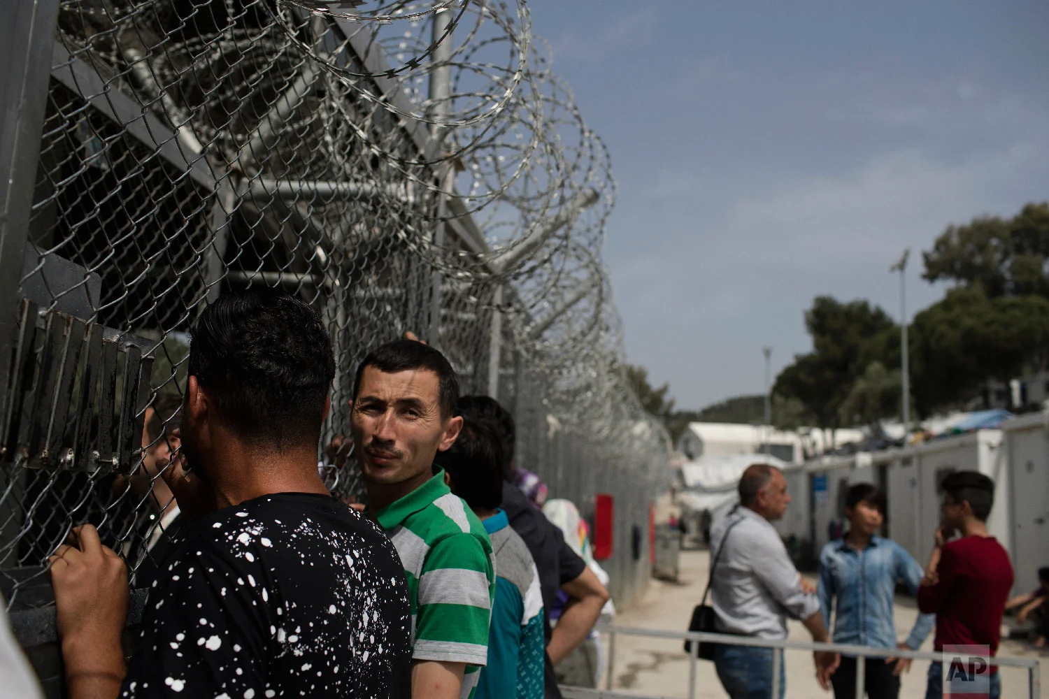 Migrants and refugees wait outside the European Asylum Support Service offices inside the camp of Moria on the northeastern Aegean island of Lesbos, Greece on Friday, May 4, 2018. (AP Photo/Petros Giannakouris)