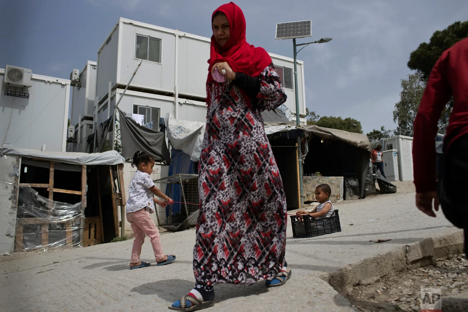 Children play as a woman walks inside the camp of Moria on the northeastern Aegean island of Lesbos, Greece on Friday, May 4, 2018. (AP Photo/Petros Giannakouris)