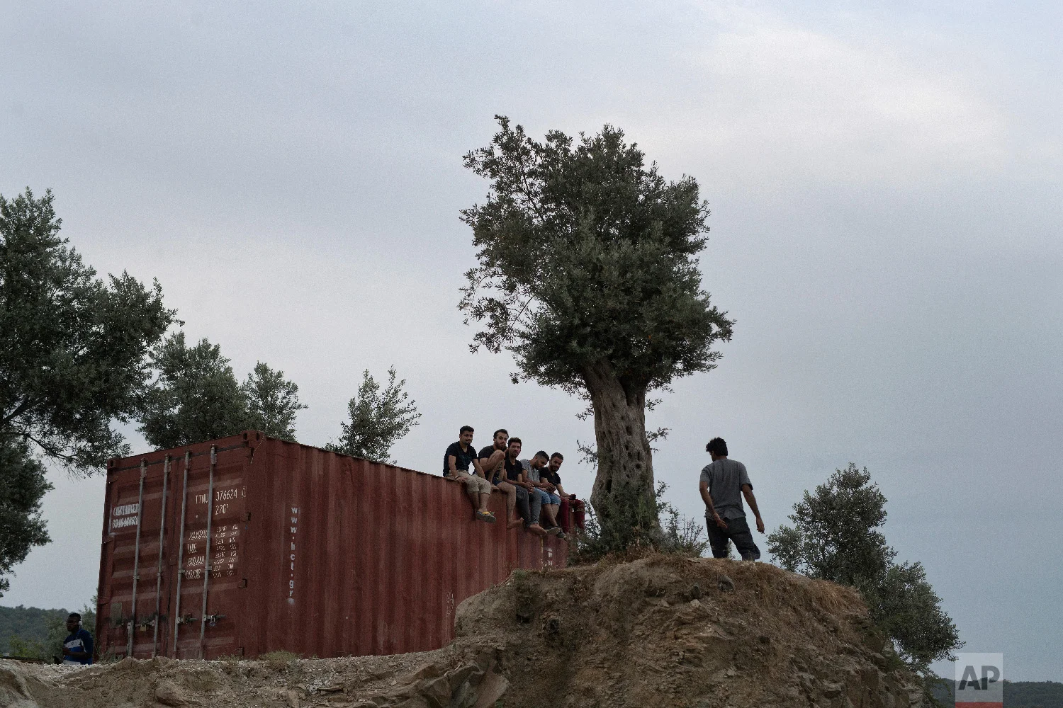 Refugees and migrants sit on the top of a container at a makeshift camp outside Moria on the northeastern Aegean island of Lesbos, Greece on Saturday May 5, 2018. (AP Photo/Petros Giannakouris)
