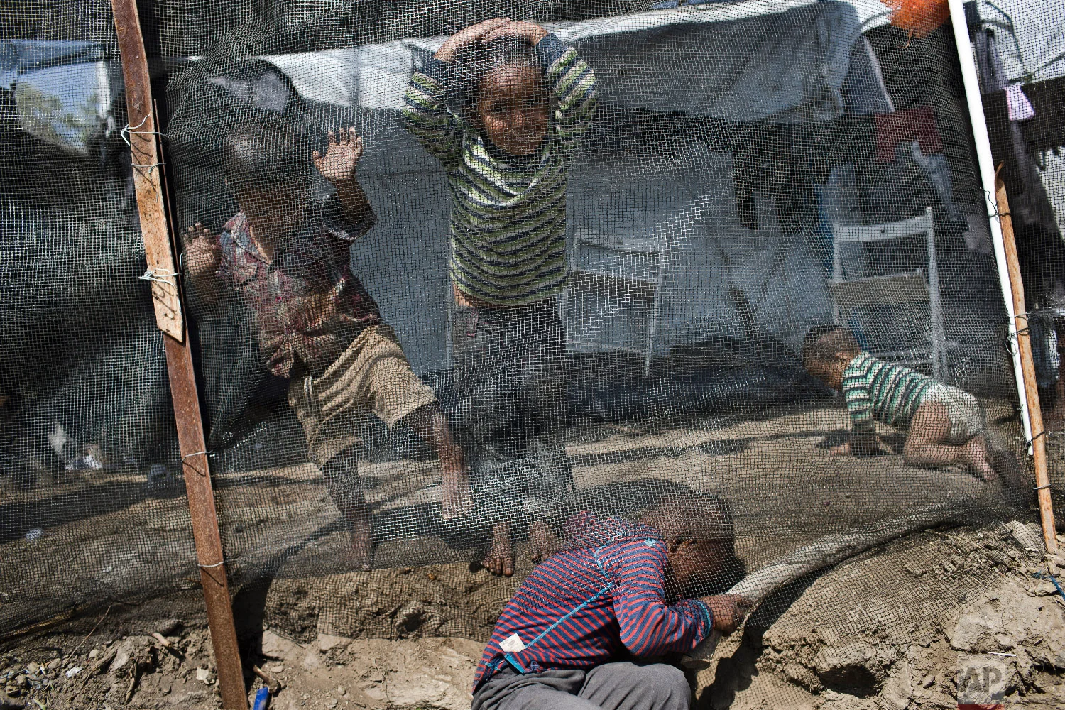 Syrian children play outside their family tent at a makeshift camp outside Moria on the northeastern Aegean island of Lesbos, Greece on Tuesday, May 2, 2018. (AP Photo/Petros Giannakouris)