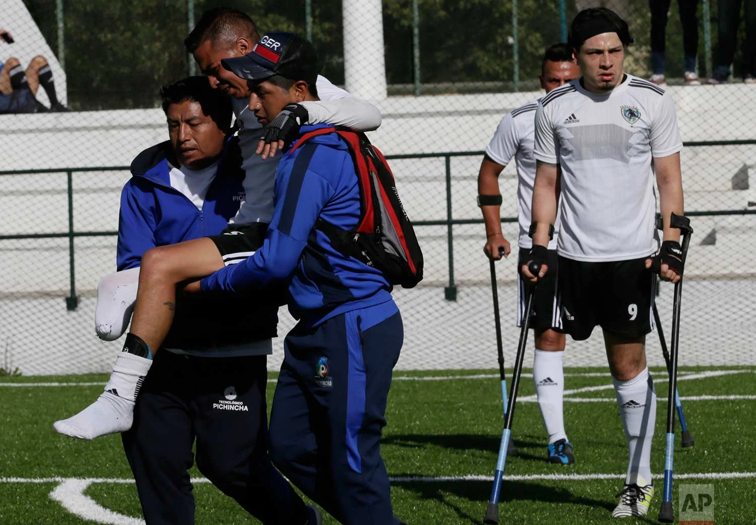 In this June 10, 2018 photo, Wilson Tianga of the Android team is carried off the field after an injury, during a game against Fuerzas Armadas as part of the national soccer tournament for players with amputated limbs, in Quito, Ecuador. Six teams comprising of 72 players, including two women, competed at the tournament and was won this year by Android. (AP Photo/Dolores Ochoa)