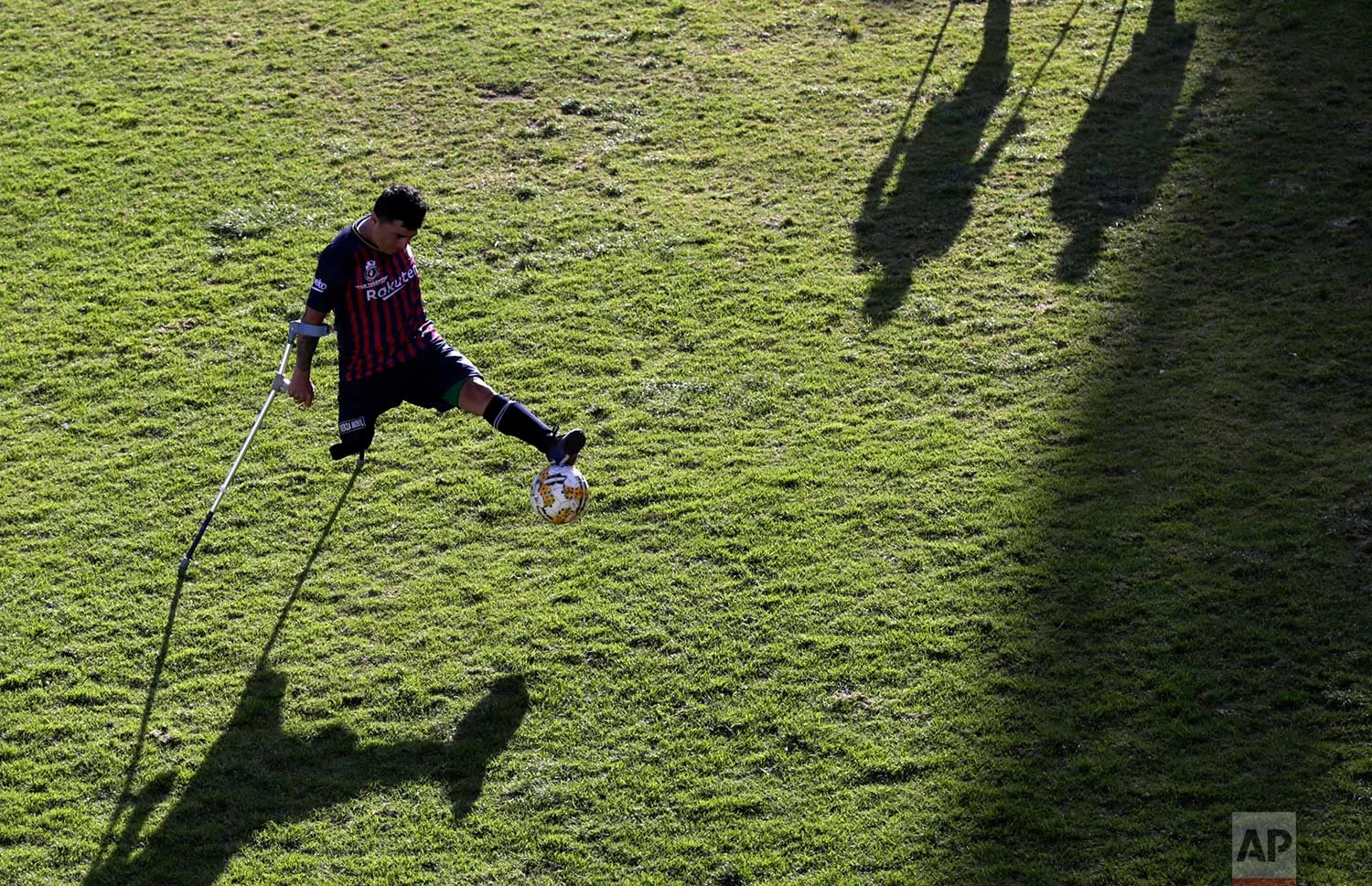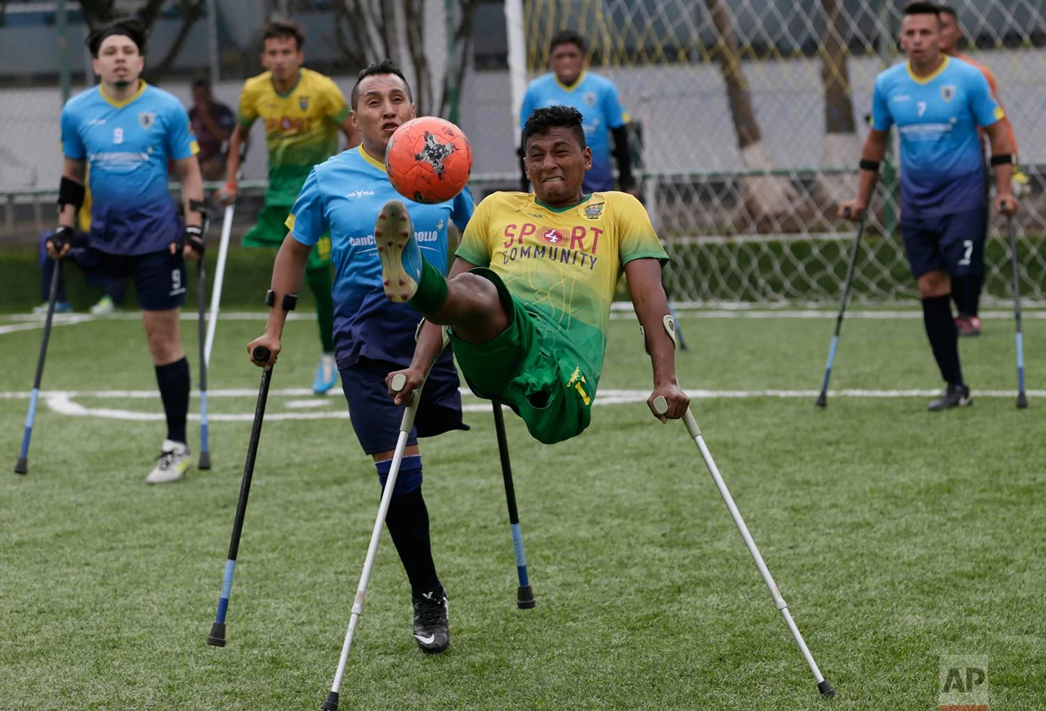 In this June 9, 2018 photo, David Arguello of the Android soccer club controls the ball while balancing himself with crutches, at a match against Fuerzas Armadas during a national soccer tournament for players with amputated limbs, in Quito, Ecuador. One-legged soccer was started in the early 1980s by Don Bennett, an active sportsman from Seattle who lost his leg in a boating accident, according to the American Amputee Soccer Association. (AP Photo/Dolores Ochoa)