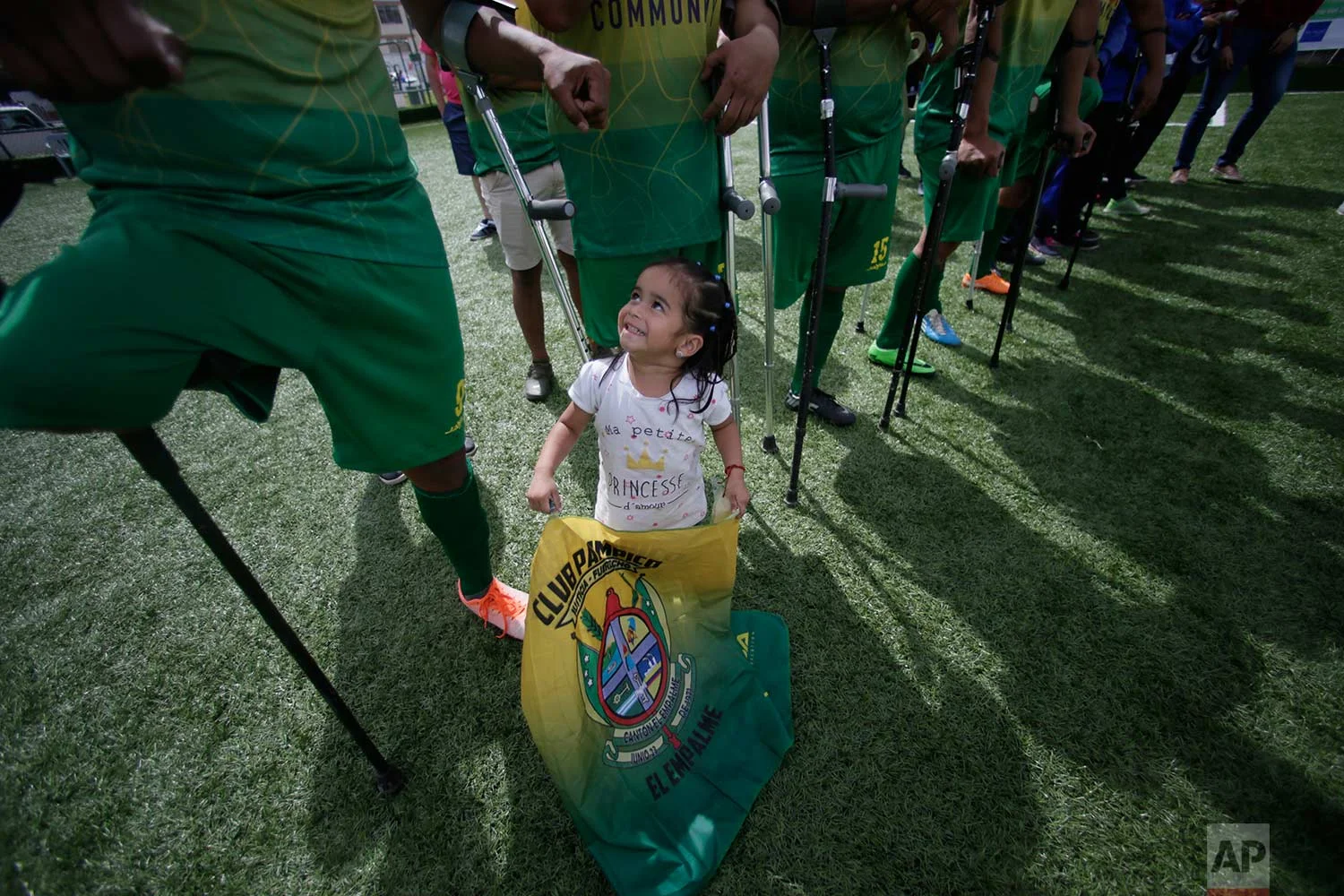 In this June 10, 2018 photo, a young fan of the El Empalme team stands with players after they won the the national soccer tournament for players with amputated limbs, in Quito, Ecuador. "I want to show the world I can be the Messi of the amputees," said Holger Velez, 28, a player for El Empalme. (AP Photo/Dolores Ochoa)