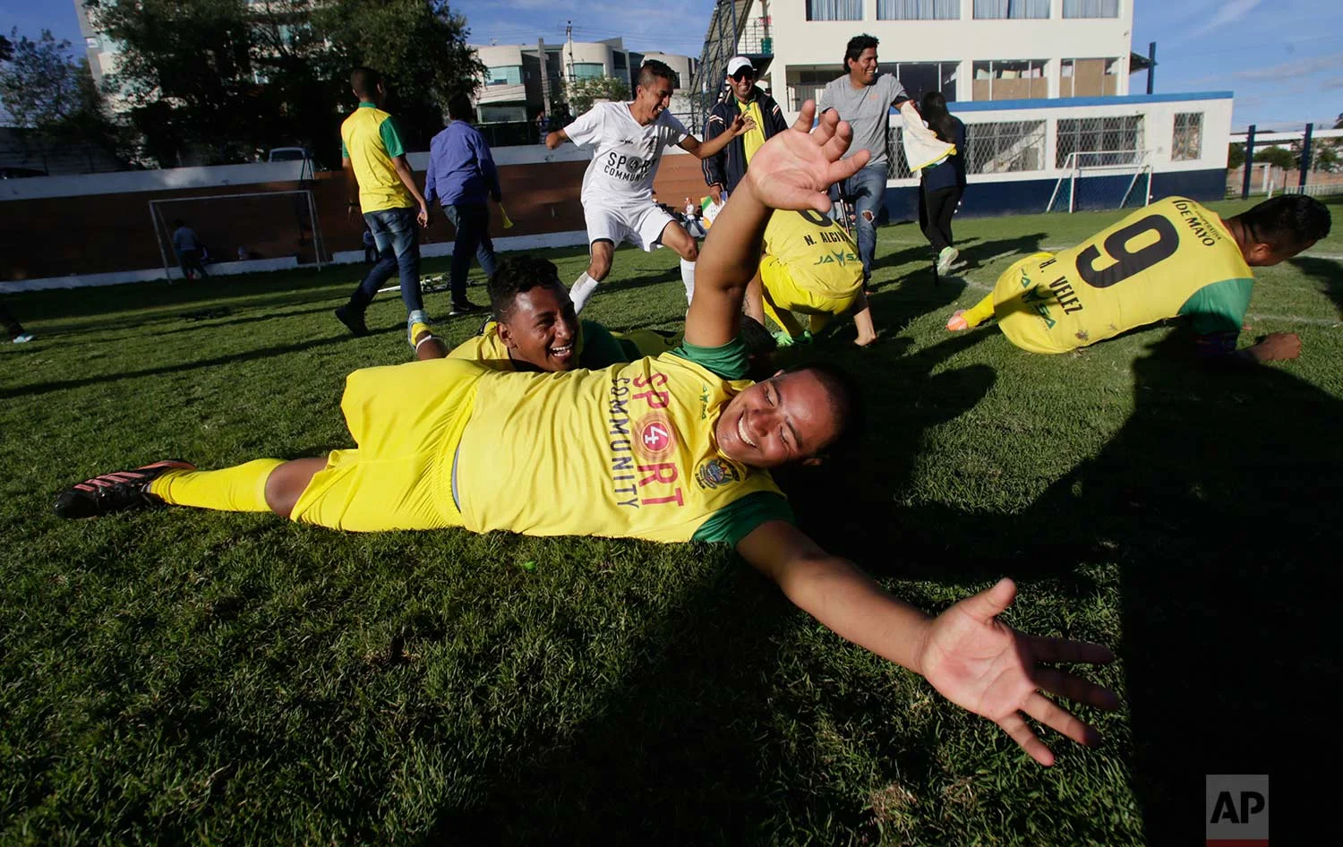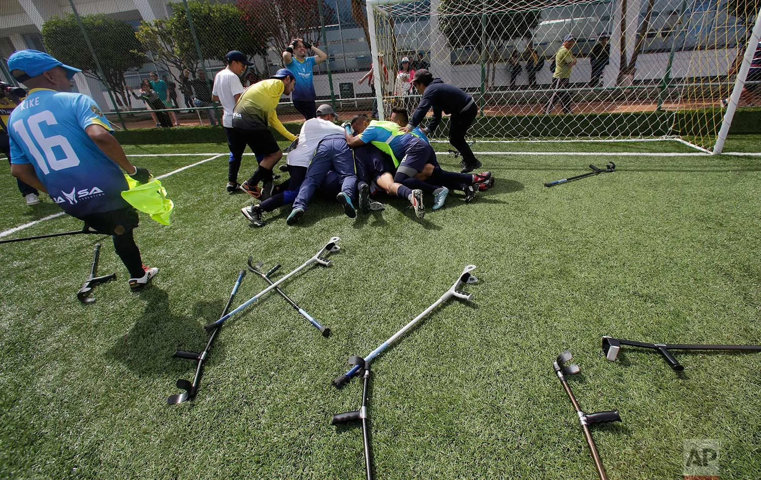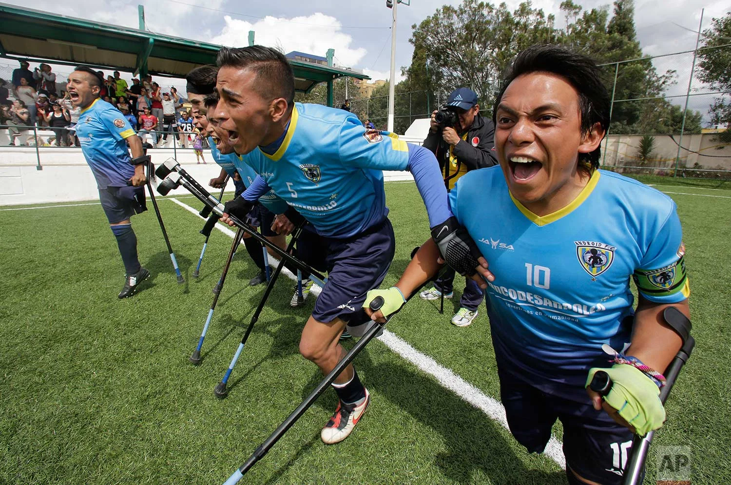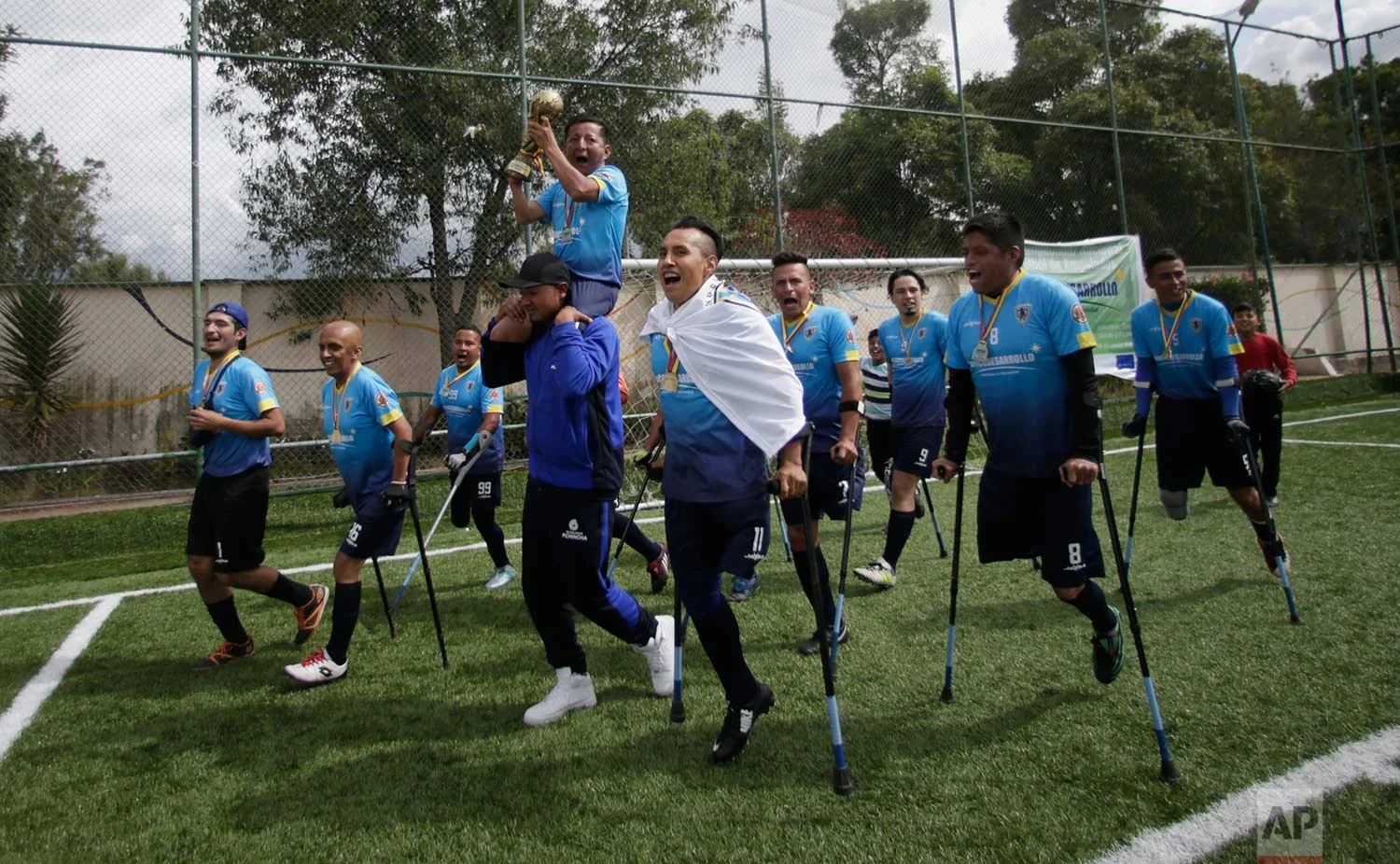 In this June 10, 2018 photo, Android team players celebrate winning the national soccer tournament for players with amputated limbs, in Quito, Ecuador. While the one-legged game is just taking off in Ecuador, it's getting a big boost from the country's president, Lenin Moreno, a wheelchair-bound paraplegic who was a major force for the rights of the disabled around the world as the United Nations' envoy on disability and accessibility in Geneva, Switzerland between 2013 and 2016. (AP Photo/Dolores Ochoa)