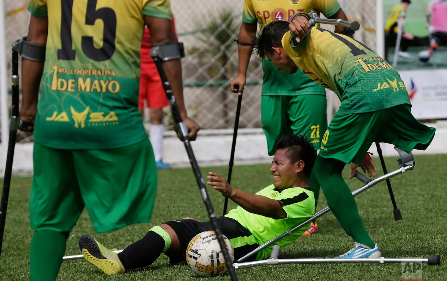 In this June 10, 2018 photo, Blas Ruiz falls on the pitch after he was fouled by the El Empalme team during a national soccer tournament for players with amputated limbs, in Quito, Ecuador. Some of the players competing at the tournament in Ecuador are hoping to be selected for a national team that will compete in the 15th World Amputee Football Federation's World Cup taking place later this year in Guadalajara, Mexico. (AP Photo/Dolores Ochoa)