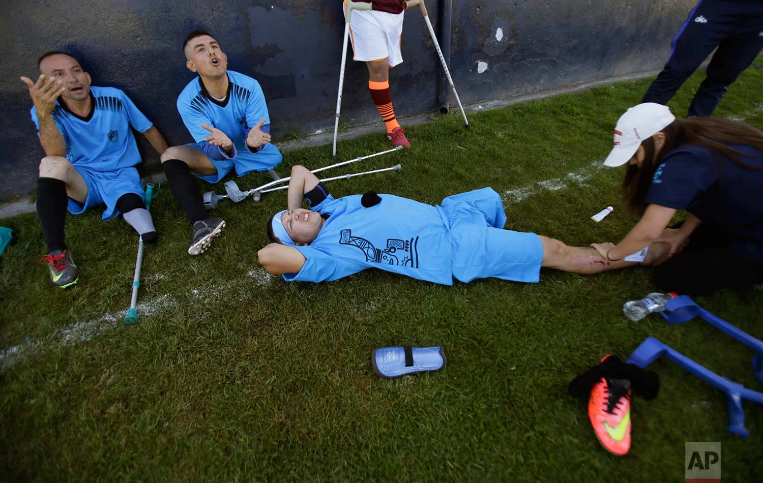 In this June 9, 2018 photo, players from the Manta Club rest as one gets physical therapy attention at the half of their match against Fuerzas Armadas during a national soccer tournament for players with amputated limbs, in Quito, Ecuador. Some of the players are hoping to be selected for a national team that will compete in the 15th World Amputee Football Federation's World Cup taking place later this year in Guadalajara, Mexico. (AP Photo/Dolores Ochoa)