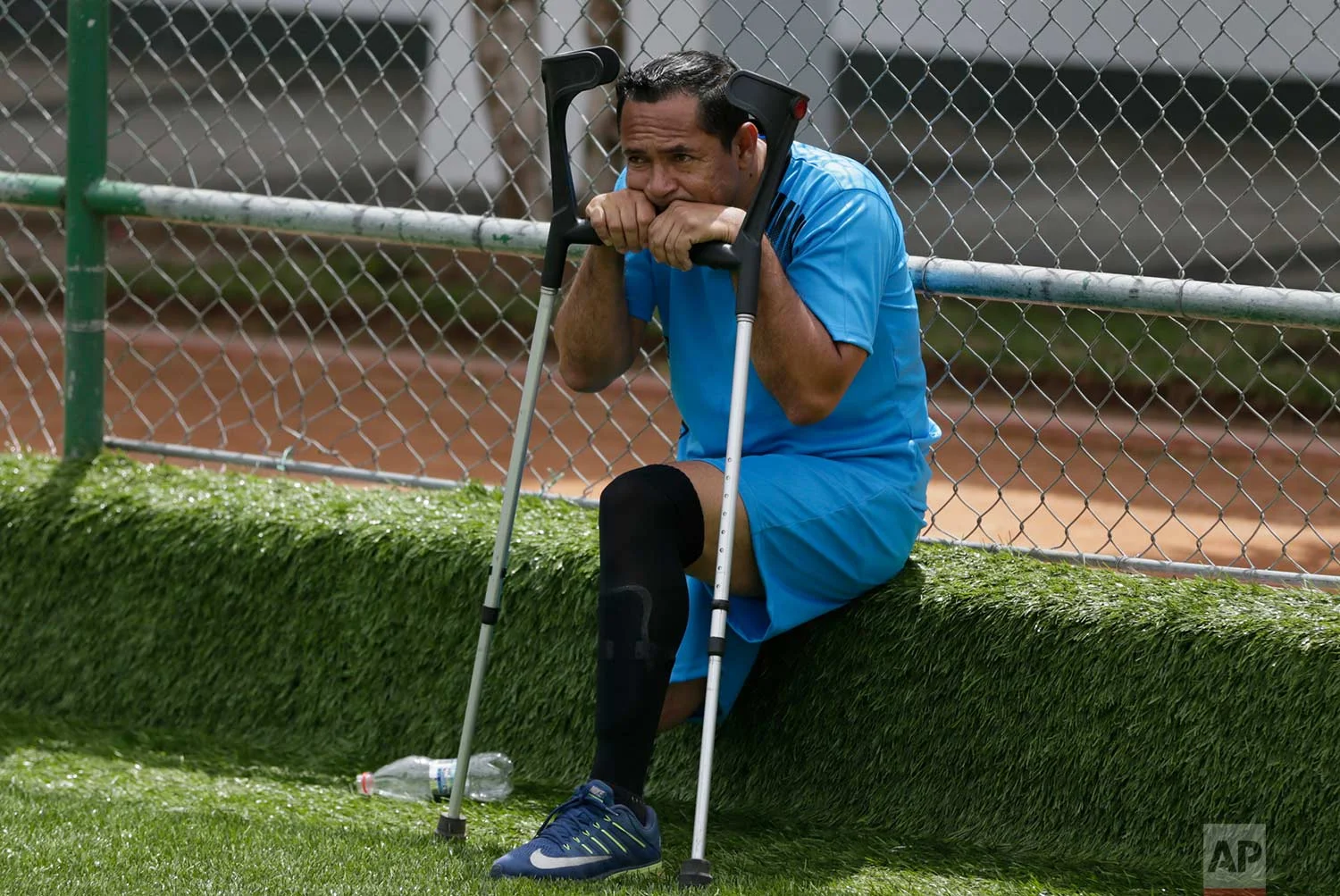 In this June 8, 2018 photo, Edison Rivas, member of the Manta Club, sits dejected after his team was defeated by Fuerzas Armadas at the national soccer tournament for players with amputated limbs, in Quito, Ecuador. While the one-legged game is just taking off in Ecuador, it's getting a big boost from the country's president, Lenin Moreno, a wheelchair-bound paraplegic who was a major force for the rights of the disabled around the world as the United Nations' envoy on disability and accessibility in Geneva, Switzerland between 2013 and 2016. (AP Photo/Dolores Ochoa)
