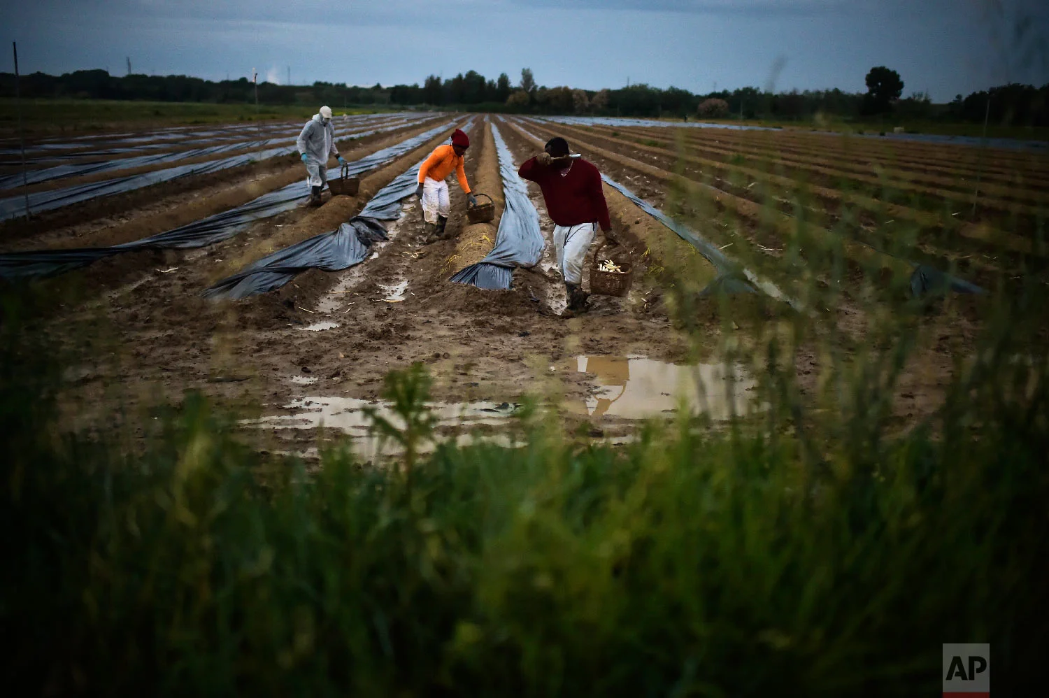 Seasonal workers collect white asparagus from a field in Caparroso, around 85 km (52 miles) from Pamplona, northern Spain on Thursday, May 31, 2018. (AP Photo/Alvaro Barrientos)