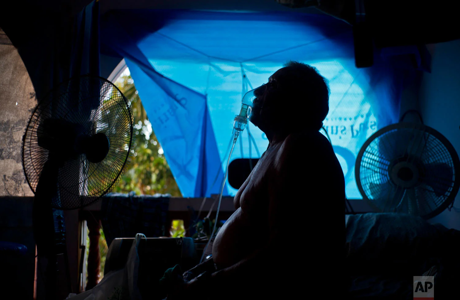 Gilberto Cosme Rodriguez takes one of his 10 a day asthma treatments. Sept. 9, 2018. (AP Photo/Ramon Espinosa)