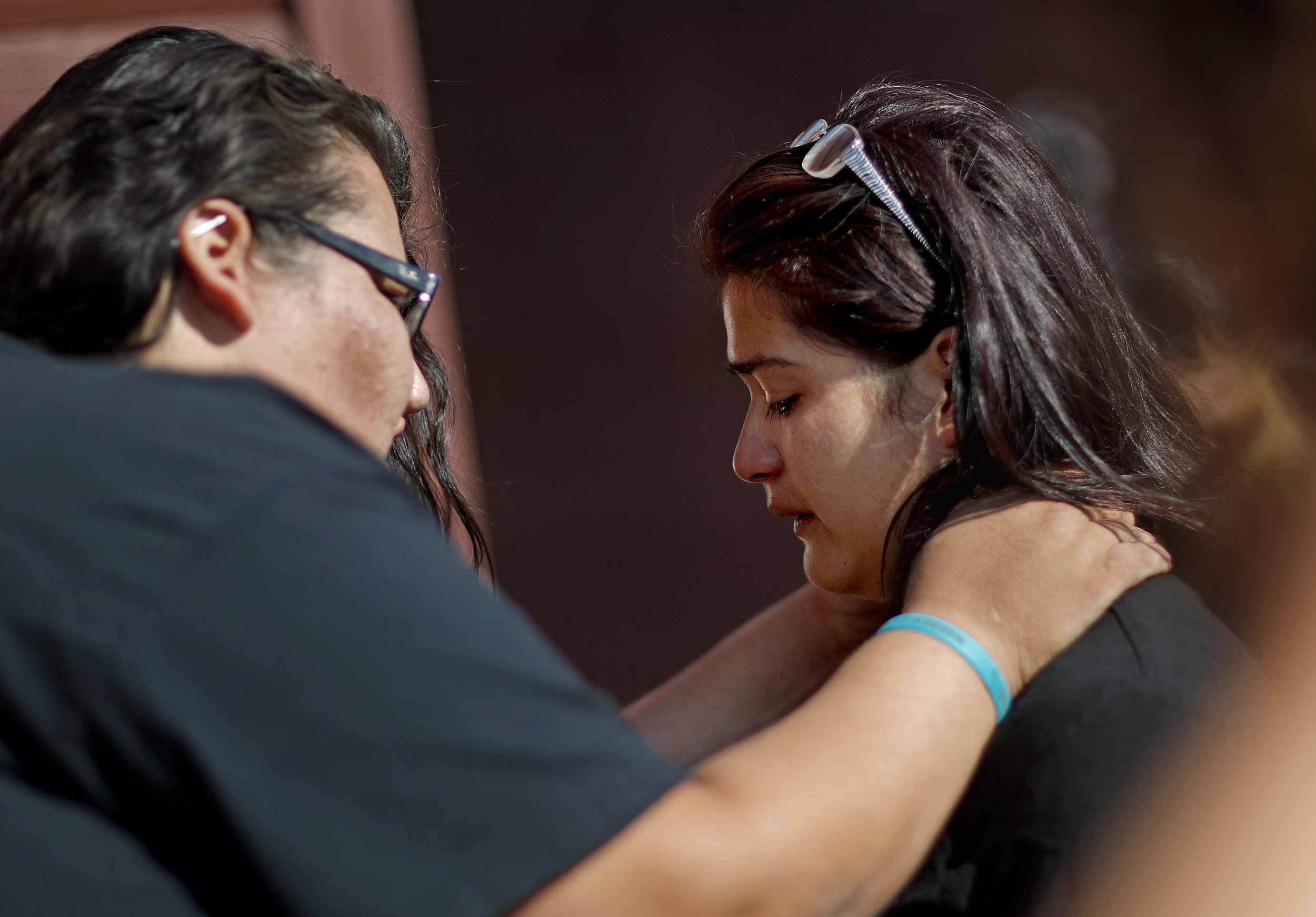 Jenna Loring, left, the aunt of Ashley HeavyRunner Loring, cries with her cousin, Lissa Loring, during a traditional blanket dance before the crowd at the North American Indian Days celebration on the Blackfeet Indian Reservation in Browning, Mont., July 14, 2018. (AP Photo/David Goldman)