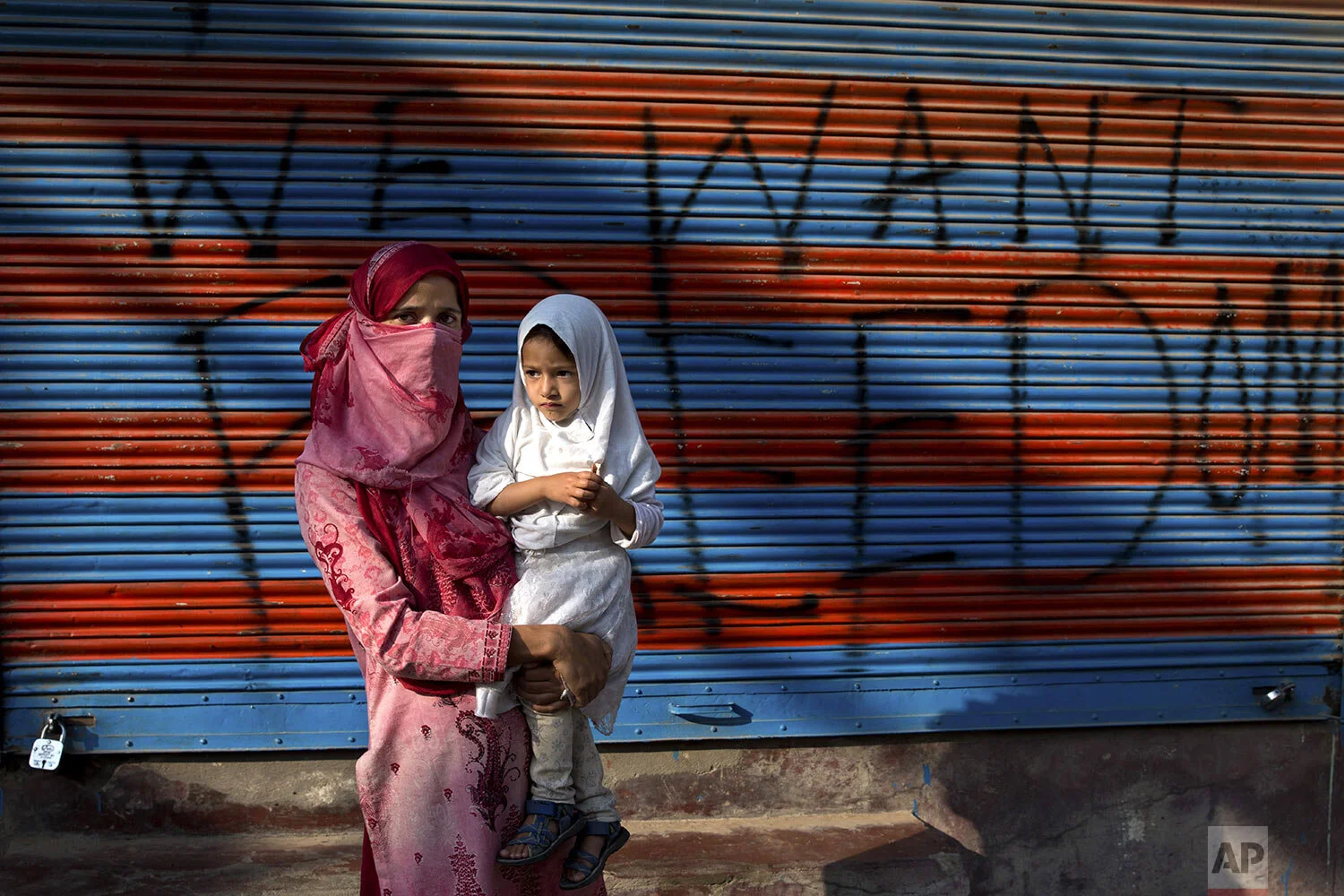 Jawahira Banoo carries her 3-year-old daughter Rutba while standing for a photograph outside a shop with a graffiti message after a protest on the outskirts of Srinagar, Indian controlled Kashmir. Banoo says she does not miss an opportunity to come out to the streets to protest.
