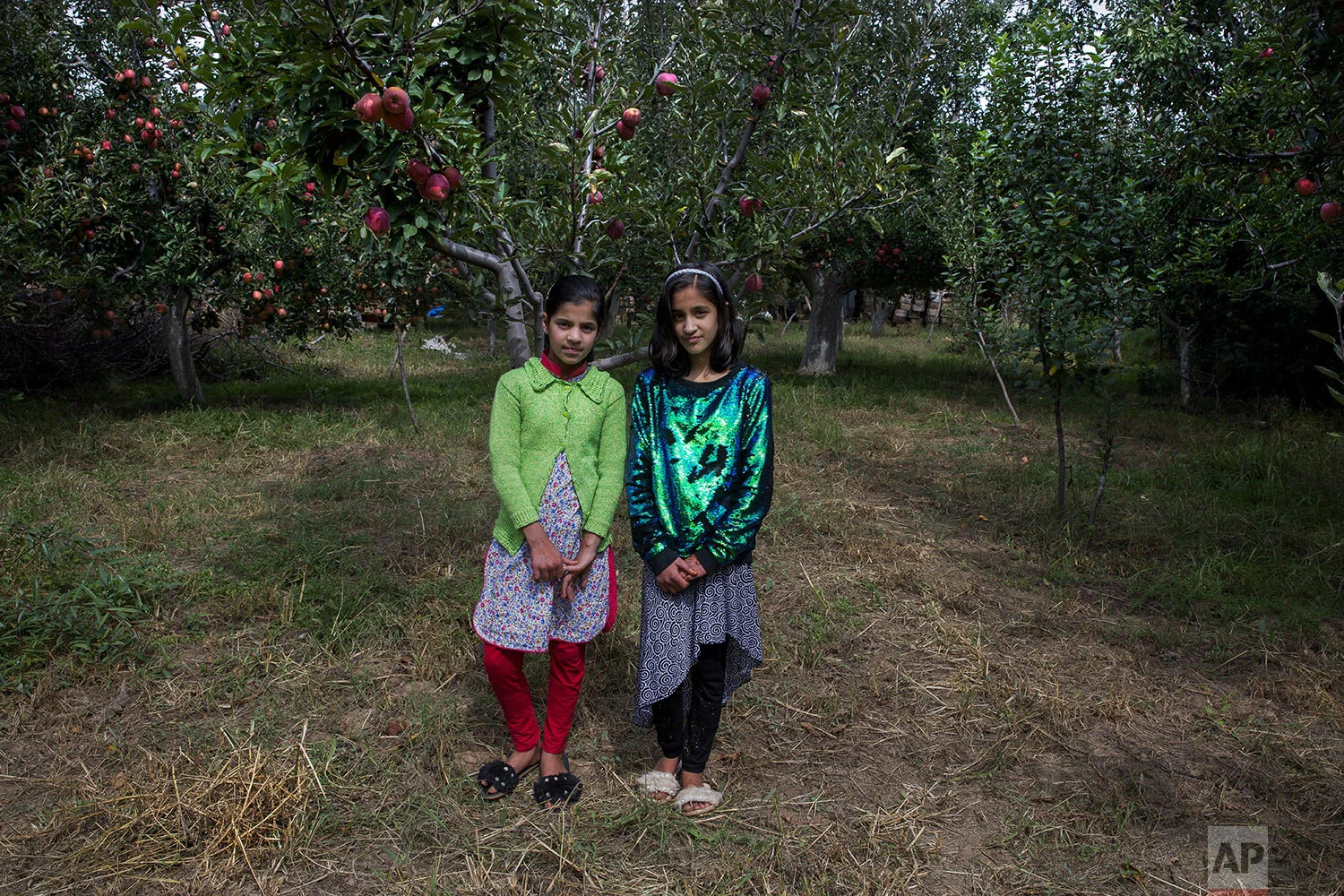 Twin sisters Tabeer Shafi Bhat, right, and Taseer Shafi Bhat stand for photographs inside an apple orchard in Wuyan, south of Srinagar, Indian controlled Kashmir. The girls said that they've had nothing to do since the lockdown started on Aug. 5 and that they miss going to school. Authorities encouraged students to return to school but parents have largely remained unwilling to send their kids to educational institutes due to the restrictions in place.