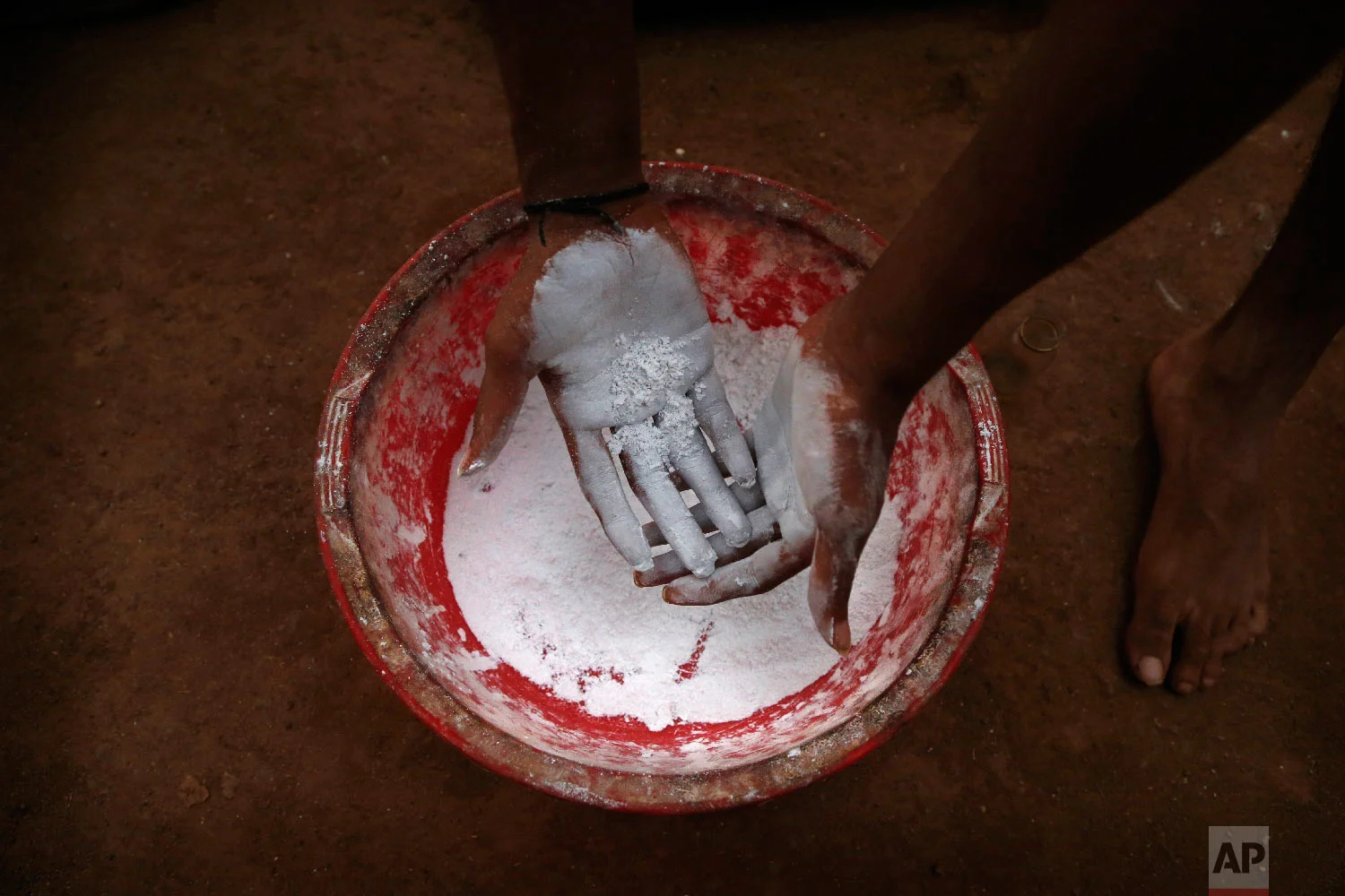 A player powders his hands before performing on a mallakhamb pole at Shivaji Park on Feb. 5, 2019, in Mumbai, India. (AP Photo/Rafiq Maqbool)
