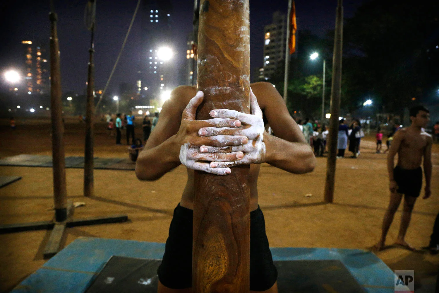 A player tightens his grip on a mallakhamb pole as he trains at Shivaji Park on Feb. 4, 2019, in Mumbai, India. (AP Photo/Rafiq Maqbool)