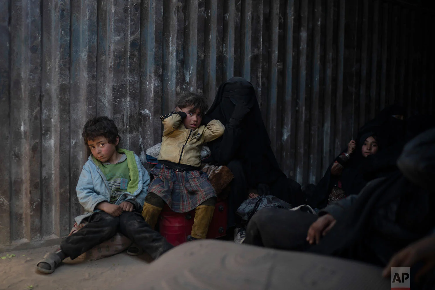Women and children ride in the back of a truck that is part of a convoy evacuating hundreds out of the last territory held by Islamic State militants in Baghouz, eastern Syria, Feb. 20, 2019. (AP Photo/Felipe Dana)