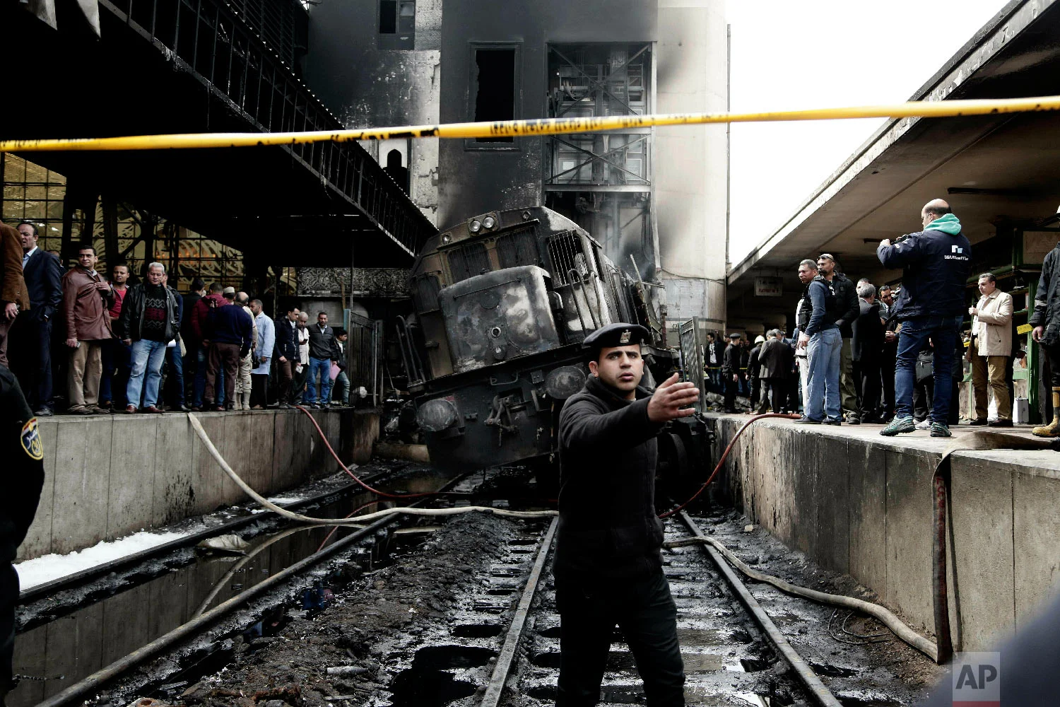 Railway officials said the single railcar collided head-on with the buffer stop, causing a huge explosion and fire. The deadly blaze blasted through people on the platform in the busy Ramses Station in downtown Cairo. A surveillance video showed the moment of impact when the car barreled past men and women walking by and engulfed them in flames and smoke.
