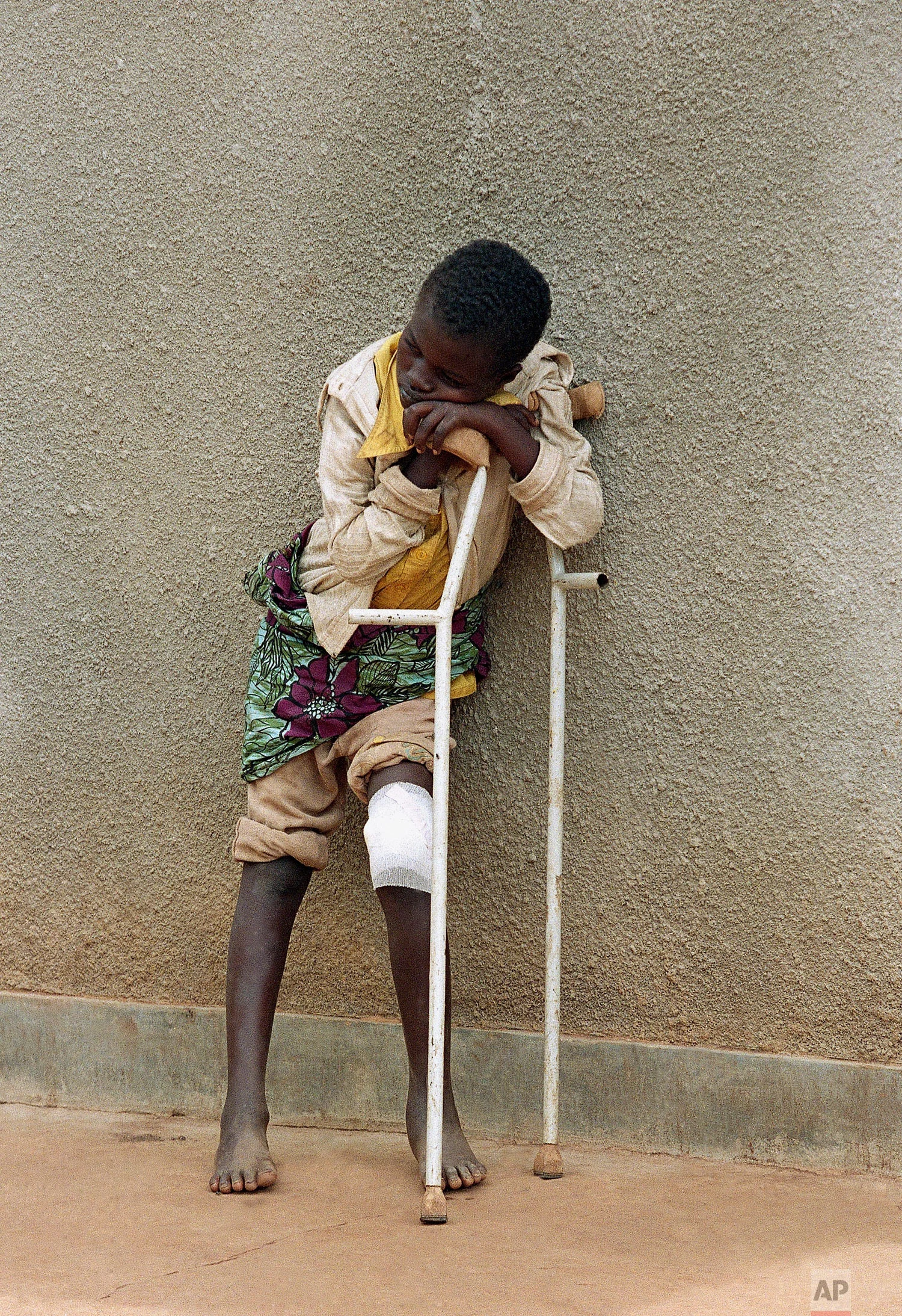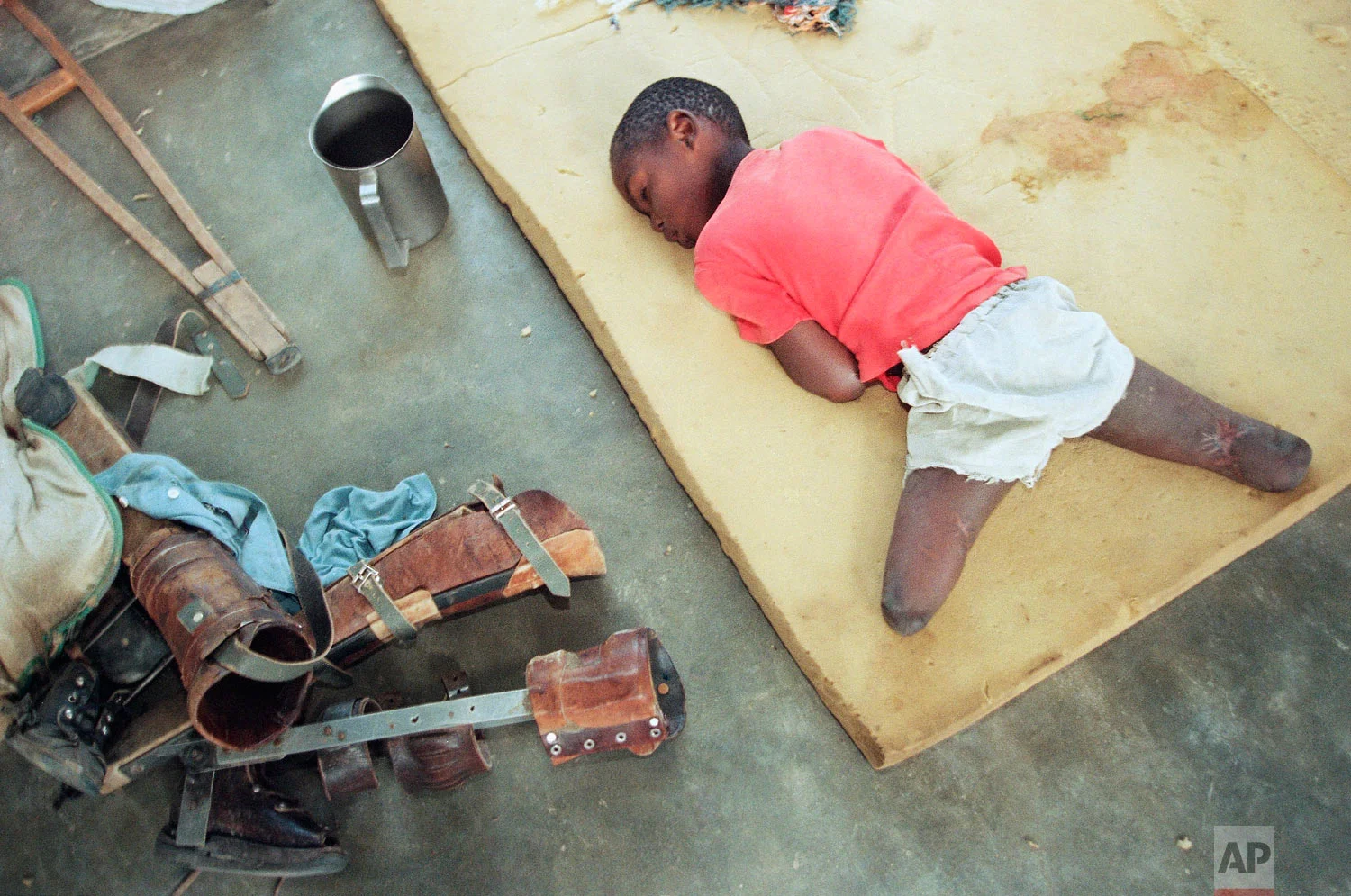 A young orphan, his legs amputated below the knee, rests on a foam cushion near his artificial limbs at an orphanage in Nyanza, near the capital Kigali, Rwanda, June 9, 1994. (AP Photo/Jean-Marc Bouju)