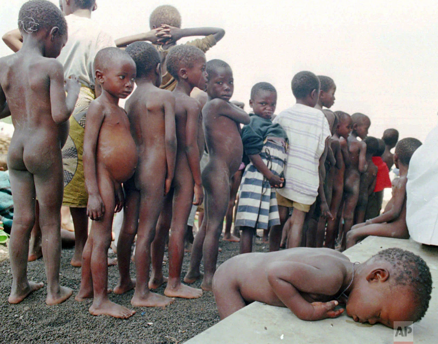 A Rwandan child too weak to stand in line to receive a vaccination, rests his head at the SOS village orphanage in Ndosho near Goma, in Zaire, now known as Congo, July 28, 1994. (AP Photo/Jacqueline Arzt Larma)