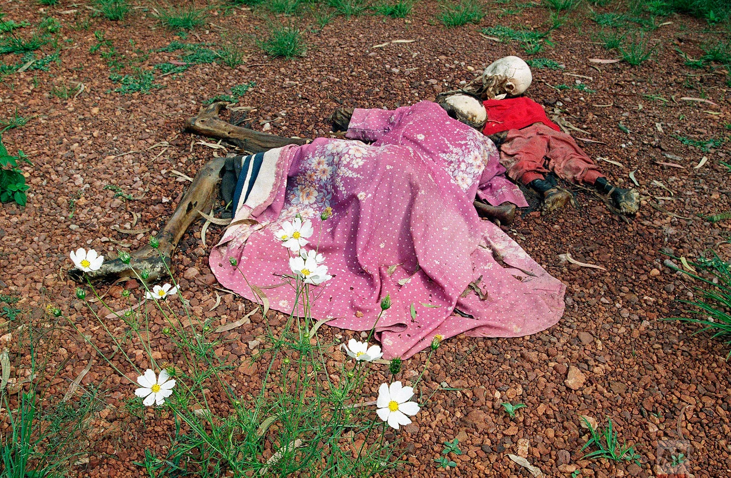 The bodies of a woman and her child lie by a church in Nyarubuye parish, which was the site of an April 14 massacre that survivors say was perpetrated by a militia assisted by government gendarmes, about 95 miles east of the capital Kigali, in Rwanda on May 31, 1994. (AP Photo/Jean-Marc Bouju)