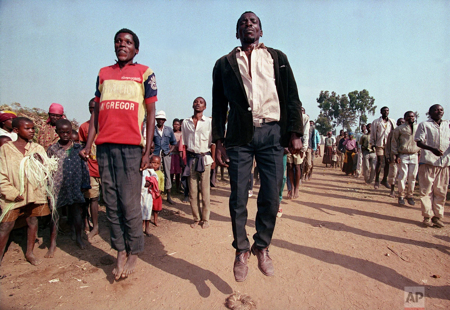 Displaced Hutu civilians in Cyanika, about 50 miles southwest of Kigali, jump in the air as part of government training of new Hutu militias in Rwanda, June 17, 1994. (AP Photo/Jean-Marc Bouju)