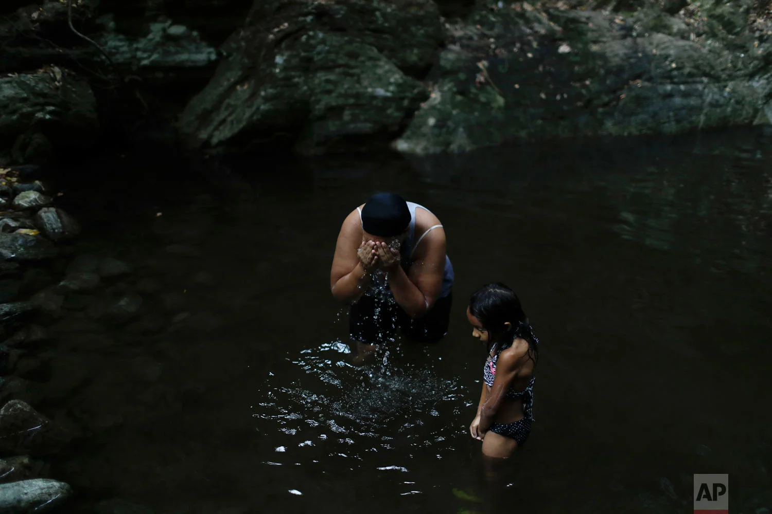 Liz Vargas and her niece Camila Vargas bathe in Avila National Park in Caracas, April 4, 2019. Vargas said she hasn't had running water at home for the previous 15 days, and this was the first time she'd come to bathe where she used to swim for fun. (AP Photo/Natacha Pisarenko)