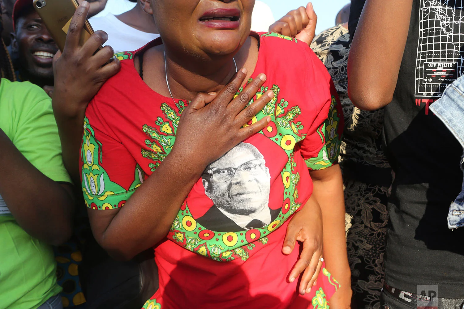 Supporters of Zimbabwe's former ruler Robert Mugabe react upon the arrival of his remains at RG Mugabe airport in Harare, Sept, 11, 2019. (AP Photo/Tsvangirayi Mukwazhi)