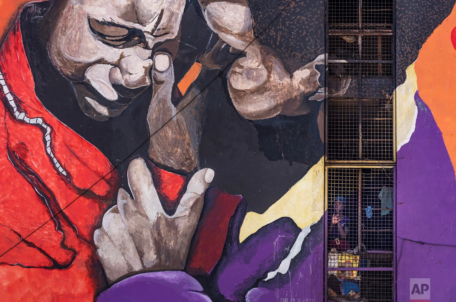 A resident looks out from the stairwell of her housing block, on which is painted an informational mural against sexual abuse, in the low income neighborhood of Mbare, known to have many supporters of former president Robert Mugabe's ZANU-PF party, in the capital Harare, Zimbabwe, Sept. 9, 2019. (AP Photo/Ben Curtis)