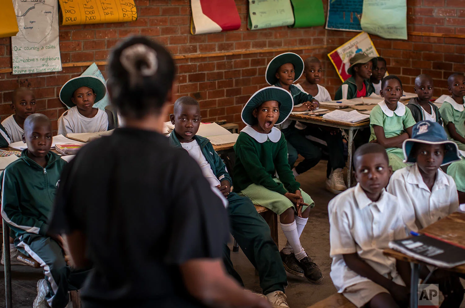 Schoolchildren attend a class in the Shona language on the first day of term at the Vimbai Primary School in Norton, west of the capital Harare, in Zimbabwe, Sept. 10, 2019. (AP Photo/Ben Curtis)